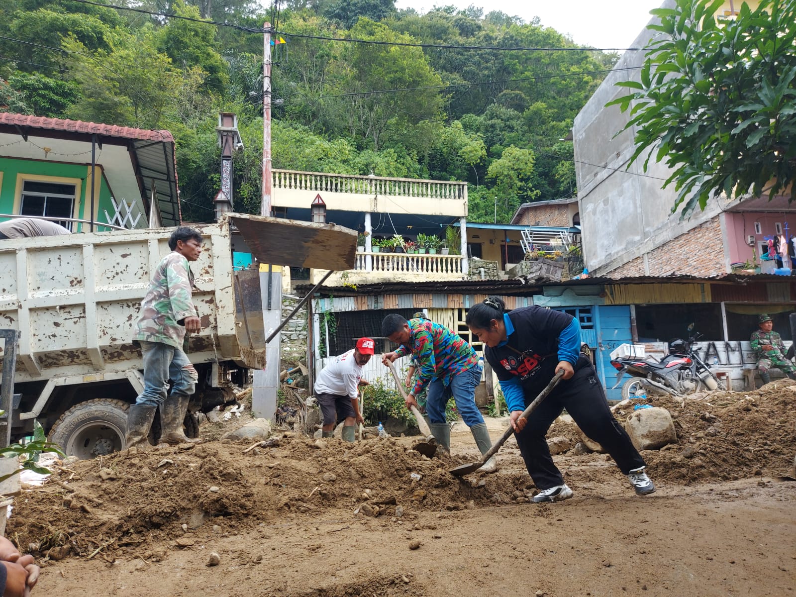 Hanya saja karena disebahagian rumah anggota ada yang agak parah dan lumpurnya lebih banyak menimbun, seperti rumah N.Ramson Simbolon, maka kita fokuskan dulu sampai lumpur dan material bebatuan di depan rumahnya sampai bersih, sembari menunggu Pemadam Kebakaran (Damkar), Ujar Benris.