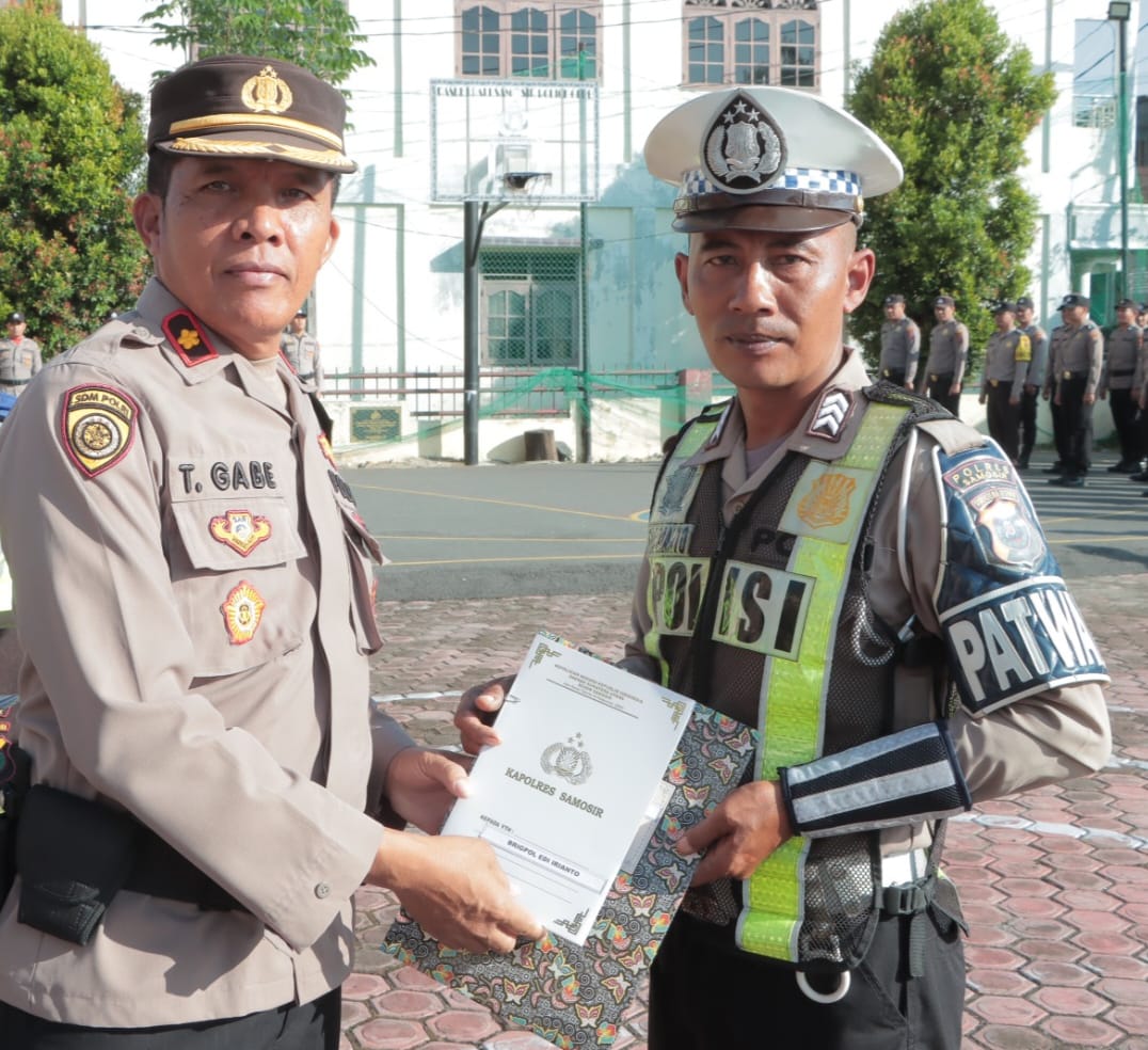 Kapolres Samosir, AKBP Yogie Hardiman, S.H., S.I.K., M.H, pimpin apel kegiatan sekaligus pemberian reward di Mako Polres Samosir, Senin (5 Februari 2024).