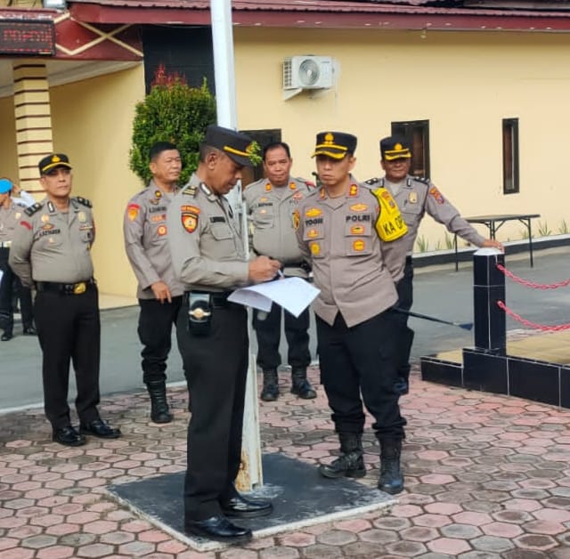 Kapolres Samosir, AKBP Yogie Hardiman, S.H., S.I.K., M.H, pimpin apel kegiatan sekaligus pemberian reward di Mako Polres Samosir, Senin (5 Februari 2024).