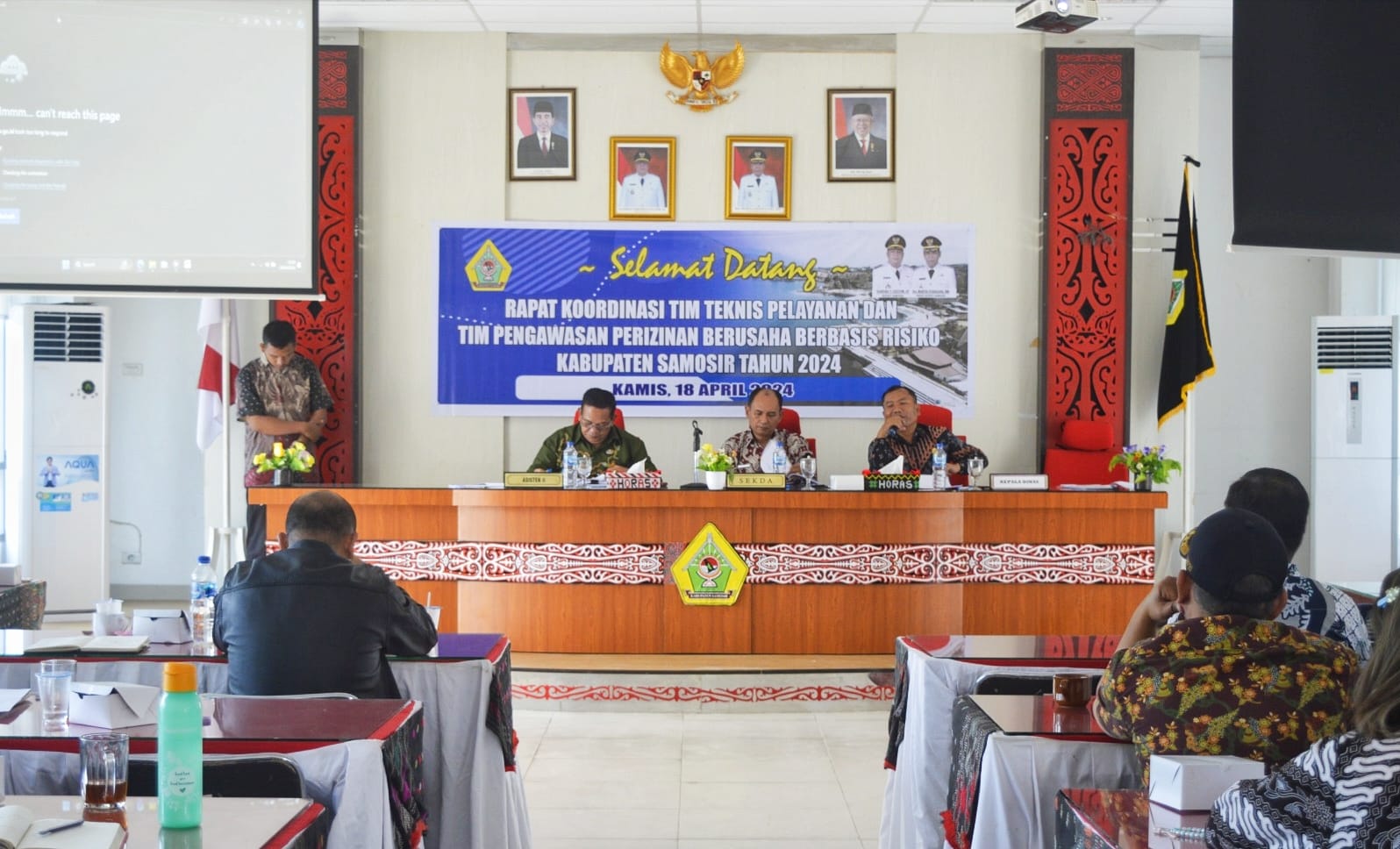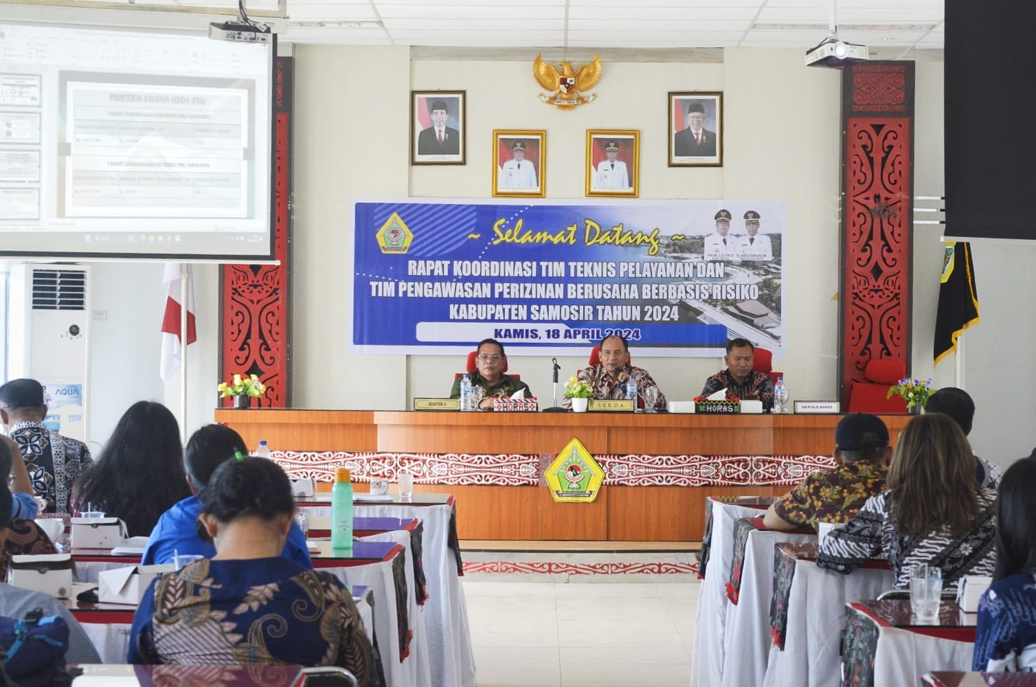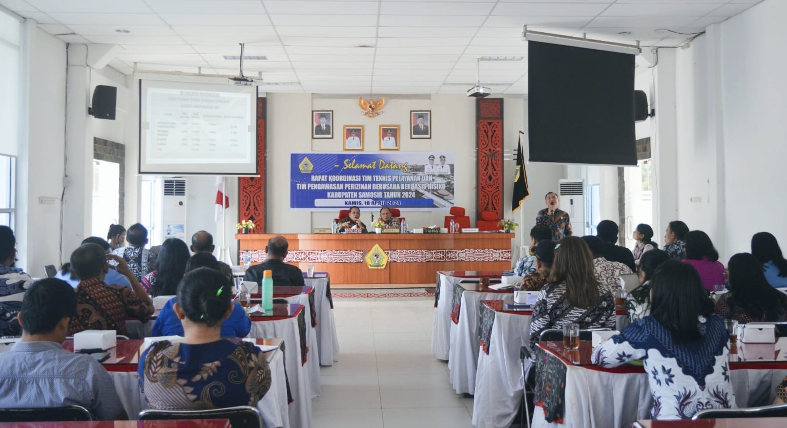 Pemerintah Kabupaten Samosir menggelar Rapat Koordinasi yang melibatkan Tim Teknis Pelayanan dan Tim Pengawasan Perizinan Berusaha Berbasis Risiko. Rakor dibuka oleh Bupati Samosir diwakili Plh. Sekretaris Daerah Marudut Tua Sitinjak didampingi Asisten II Hotraja Sitanggang, dan Kadis PMPTSP Pilippi Simarmata di Aula Kantor Bupati Samosir, Kamis (18/4).