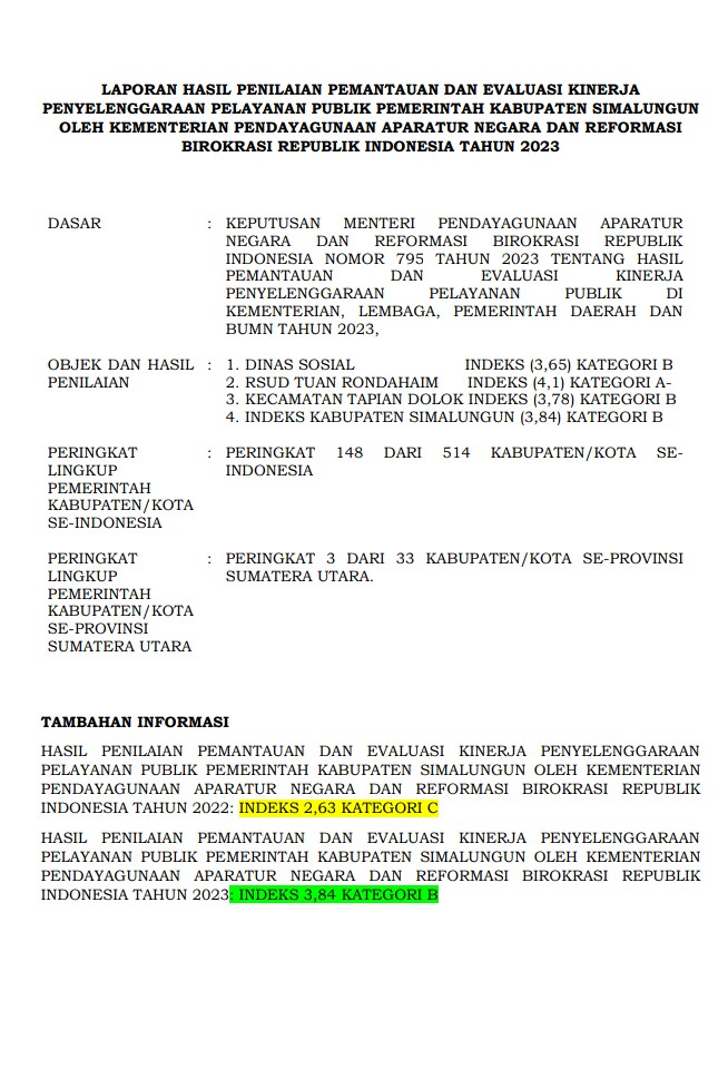 Sebelumnya pada tahun 2022 hasil penilaian pemantauan dan evaluasi kinerja penyelenggaraan pelayanan publik Pemkab Simalungun oleh Kemenpan-RB, dengan indeks 2,63 dalam kategori C.