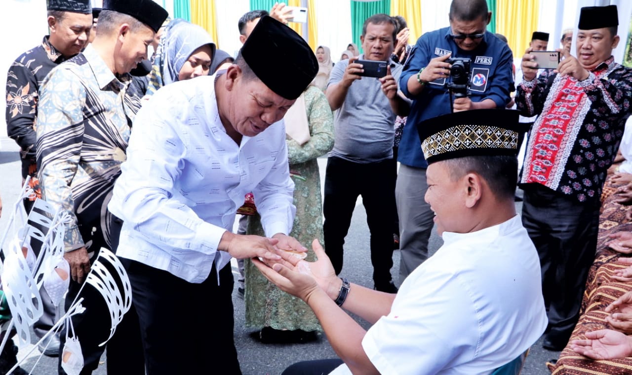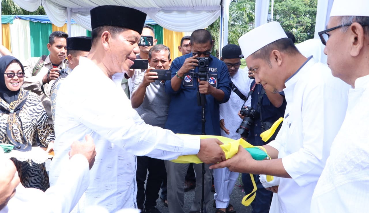 Pemerintah Kabupaten (Pemkab) Simalungun melakukan tepung tawar terhadap 203 jamaah haji/Hajjah Tahun haji 1444 H/2023 M, di halaman Masjid Asy Syuhada, Jln Asahan Kecamatan Siantar, Simalungun, Sumut, Jum’at (1/6/2023).