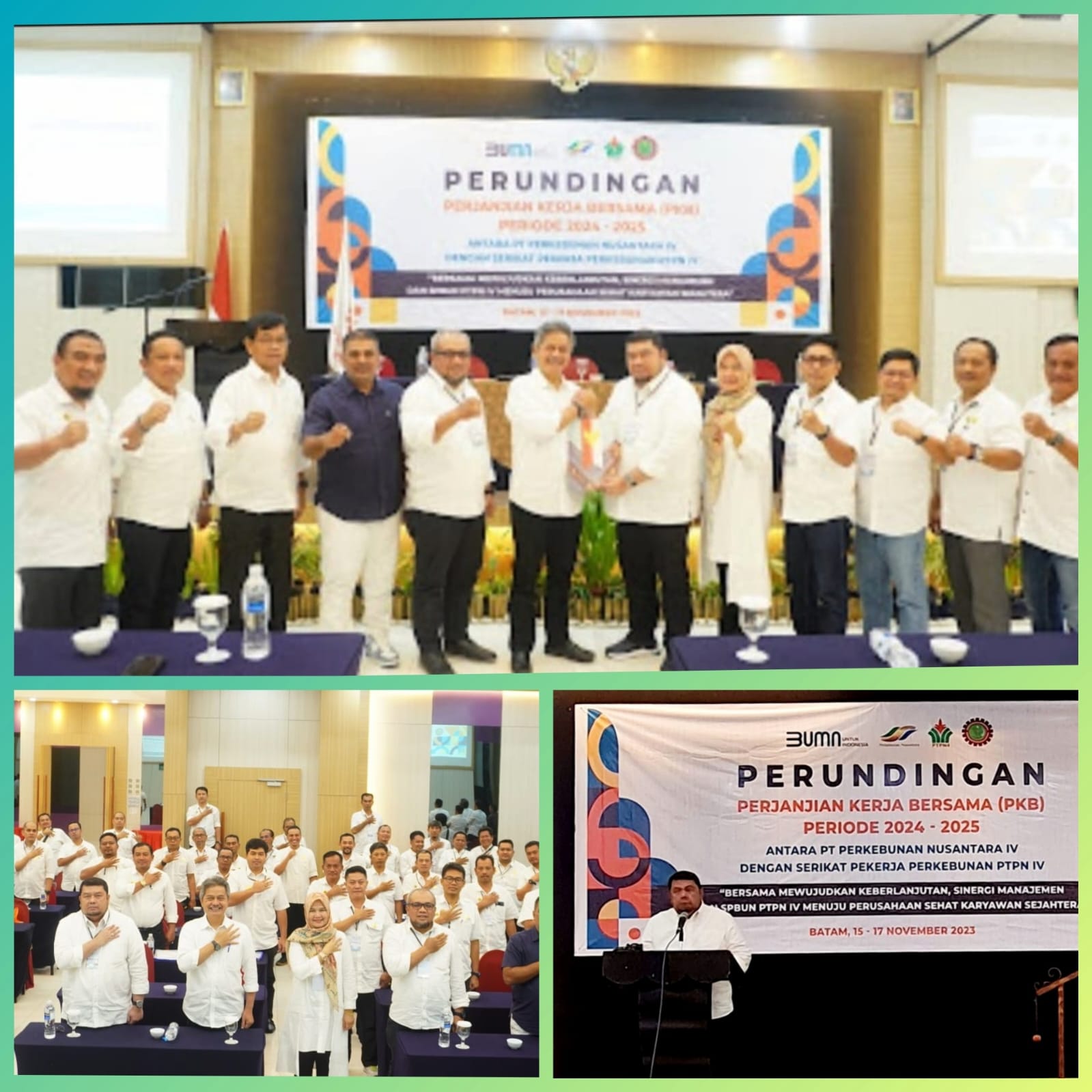 Perundingan Perjanjian Kerja Bersama (PKB) Periode 2024 – 2025,antara PT Perkebunan Nusantara IV (PTPN IV) dengan Serikat Pekerja Perkebunan (SPBUN) PT Perkebunan Nusantara IV dengan Tema “Bersama mewujudkan Keberlanjutan Sinergi Manajemen dan SPBUN PTPN IV Menuju Perusahaan Sehat Karyawan Sejahtera” telah selesai dilaksanakan pada tanggal, 15 – 17 Nopember 2023 di BATAM Kepulauan Riau.