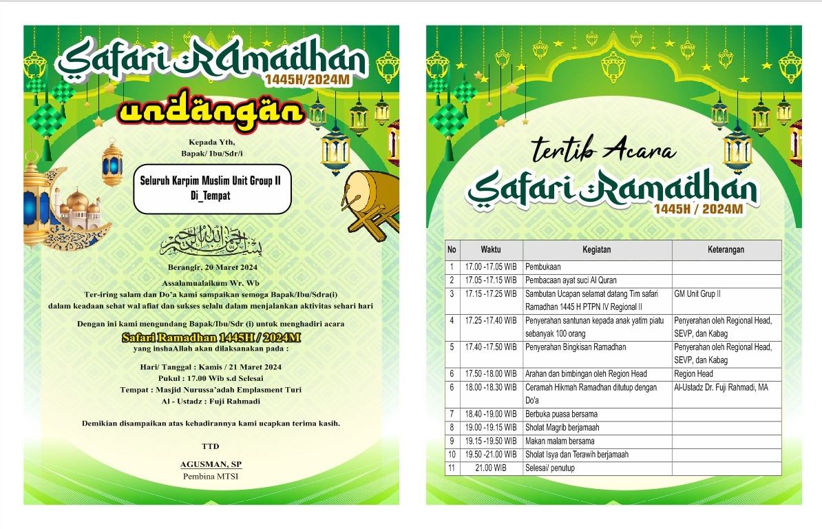 Board Of Regional Management (BRM) PT Perkebunan Nusantara IV Regional II melakukan kunjungan Safari Ramadan 1445 H ke Kantor Unit Group II , Manager Kebun dan PKS Berangir, yang di adakan di Mesjid Nur Saadah emplasmen Turi. Dalam acara tersebut sekaligus dilakukan pemberian bingkisan Ramadhan dari SEVP Op l, ll dan SEVP BS kepada Maneger Kebun dan PKS se Unit Group ll, dan santuni anak yatim serta pemberian bingkisan Al Qur’an, Kamis Tanggal 21/03/2024.