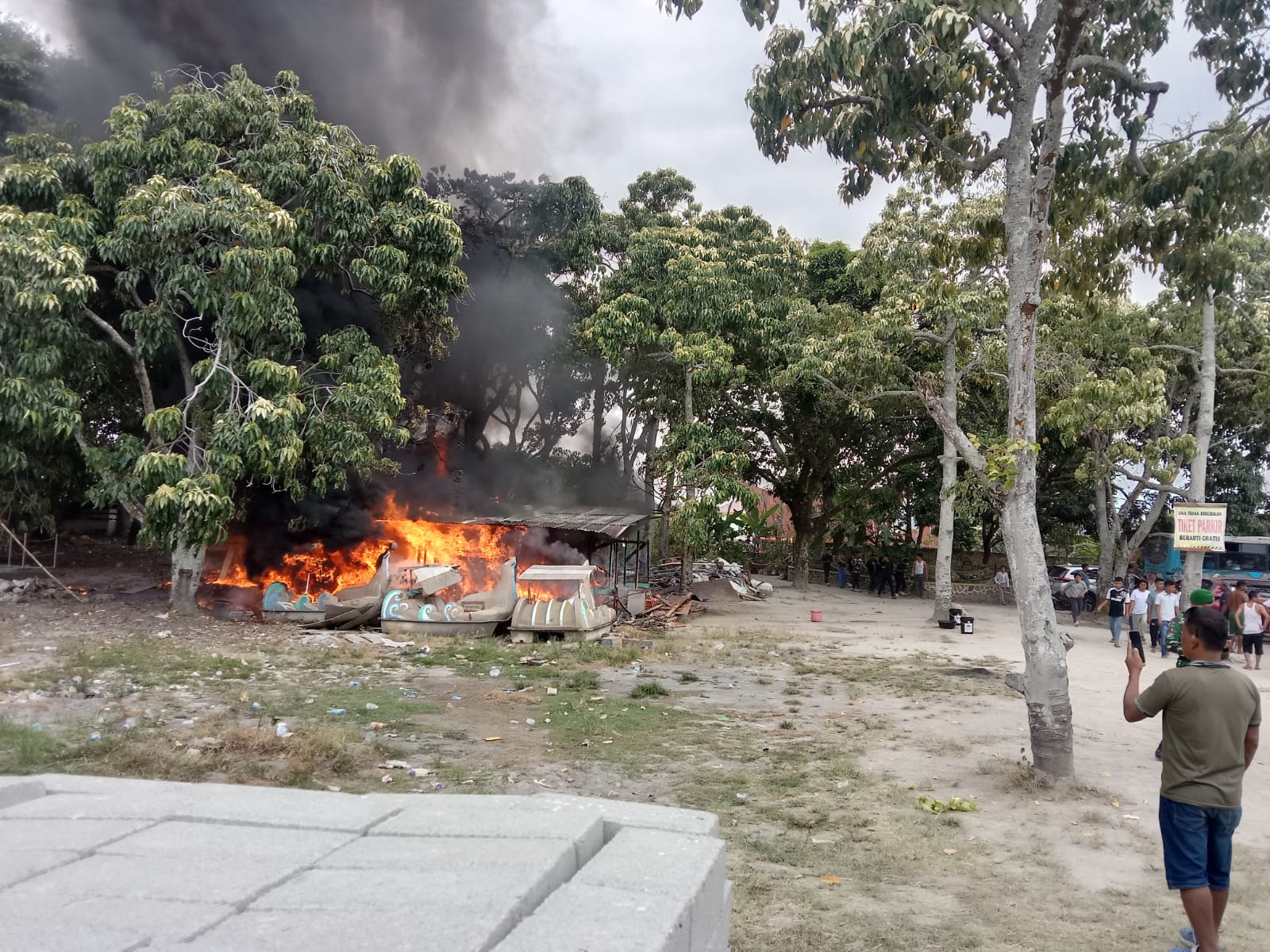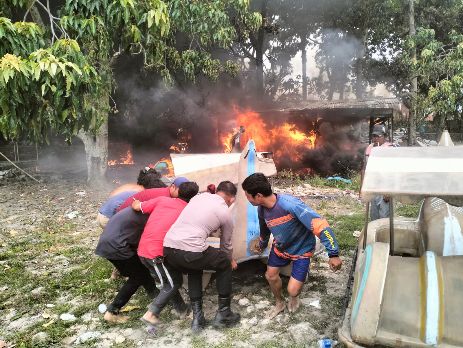 Pasukan Pos Pam bertindak cepat membantu pemadaman api dalam musibah kebakaran satu unit gudang di lokasi Parkiran Pantai Pasir Putih Parbaba, Desa Huta Bolon, Kecamatan Pangururan, Kabupaten Samosir, Selasa (9 April 2024).