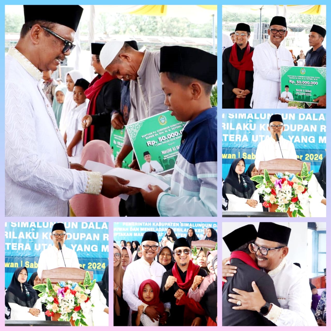 Di akhir acara, Plt. Bupati Simalungun, H. Zonny Waldi, KH. Yusuf Mansur beserta Kabiro Kesra Prov. Sumut, memberikan penyerahan santunan secara simbolis kepada 30 anak yatim dari kecamatan Dolok Batu Nanggar.