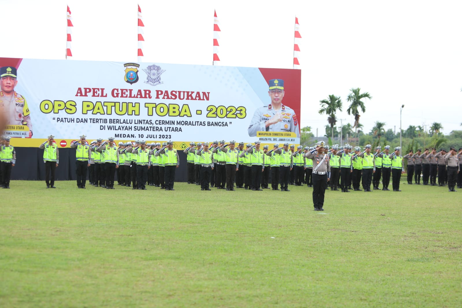 Pelaksanaan Operasi Patuh Toba 2023 ikuti sebanyak 1.345 personel gabungan dari Polri, TNI, Satpol PP, dan Dishub ditandai dengan apel gelar pasukan serta pemasangan pita operasi dipimpin Kapolda Sumut Irjen Pol RZ Panca Putra Simanjuntak di Lapangan Bola Mapoldasu, Senin (10/7).