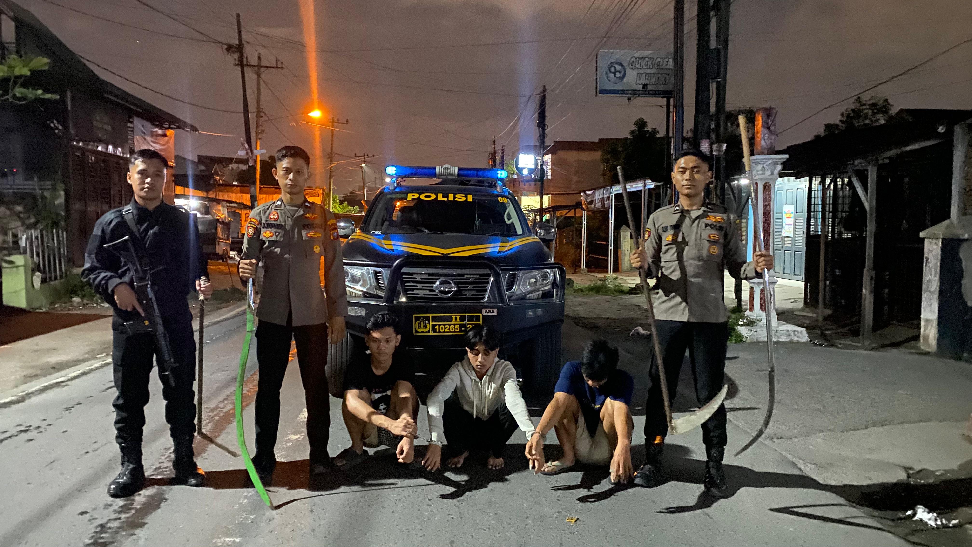 Saat tiba di lokasi, petugas mendapati tiga orang membawa empat bilah senjata tajam jenis kelewang dan celurit.