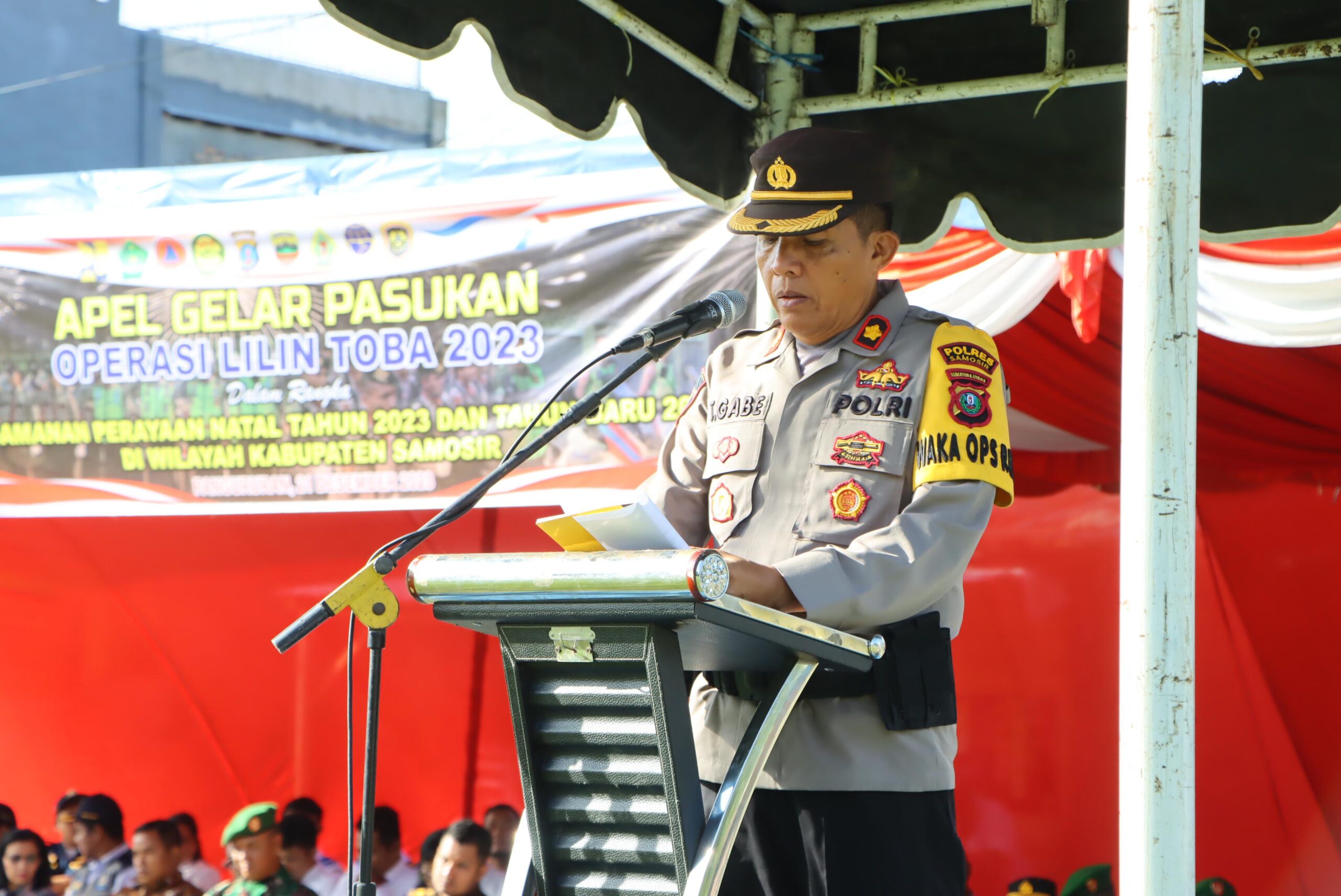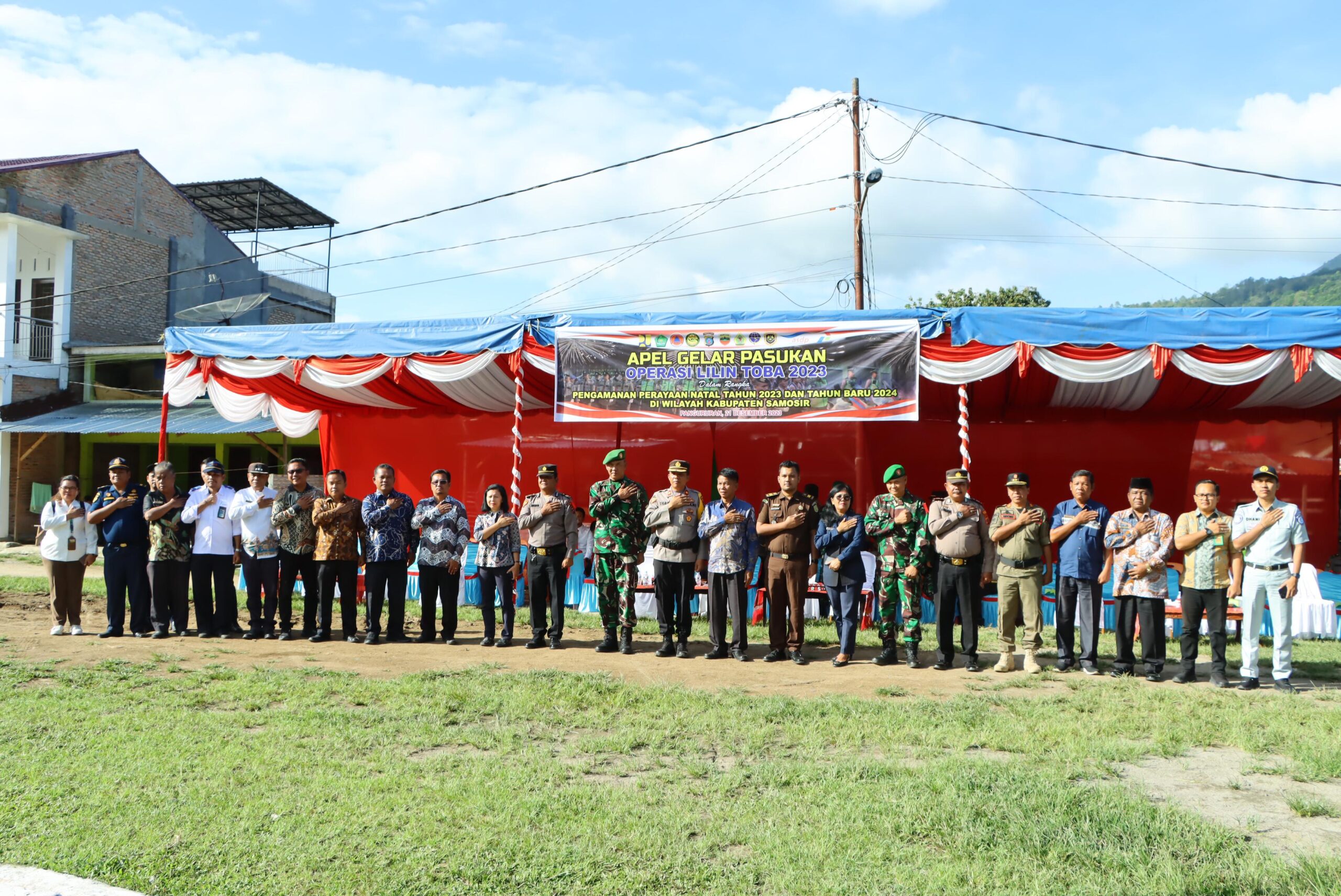 Polres Samosir apel gelar pasukan Operasi Lilin Toba 2023 dalam rangka pengamanan perayaan natal tahun 2023 dan tahun baru 2024 di wilayah Kabupaten Samosir di Tanah Lapang Pangururan Kab. Samosir, Kamis tanggal 21 Desember 2023 pukul 08.00 wib.