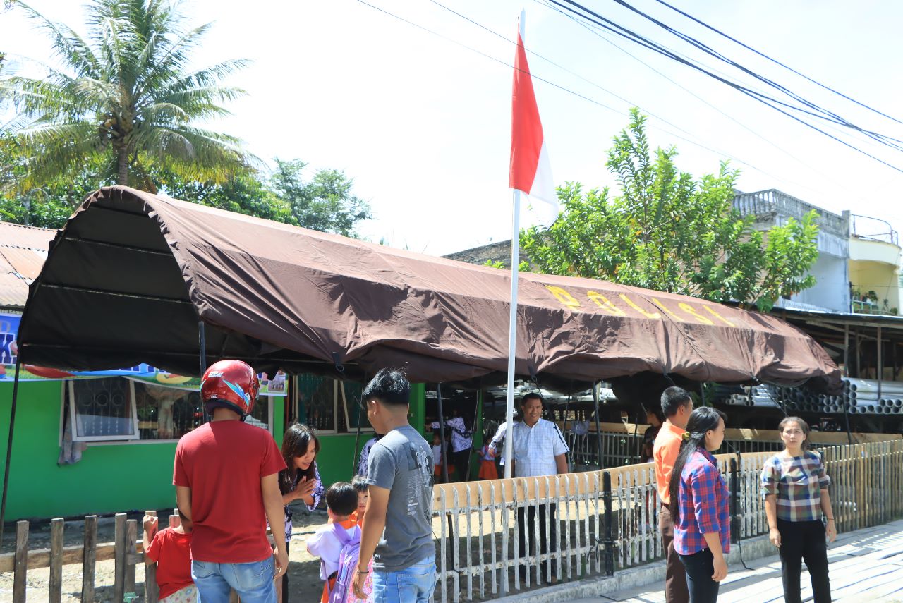 Selanjutnya rombongan menuju Sekolah Sementara TK Rajawali. Di sana, para personel Polres Samosir tengah mendirikan tenda polisi di halaman sekolah tersebut.