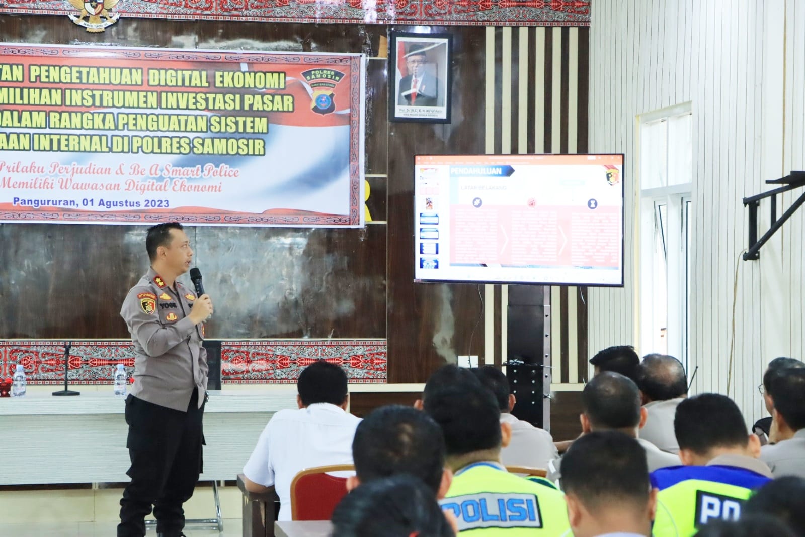 Untuk itu, Polres Samosir menggelar Kegiatan Peningkatan Pengetahuan Digital Ekonomi di Aula Wira Pinandita Mako Polres Samosir. Kegiatan ini bertujuan untuk meningkatkan pemahaman personil terkait instrumen investasi pasar modal guna memperkuat sistem internal Polres Samosir, Selasa (1 Agustus 2023).