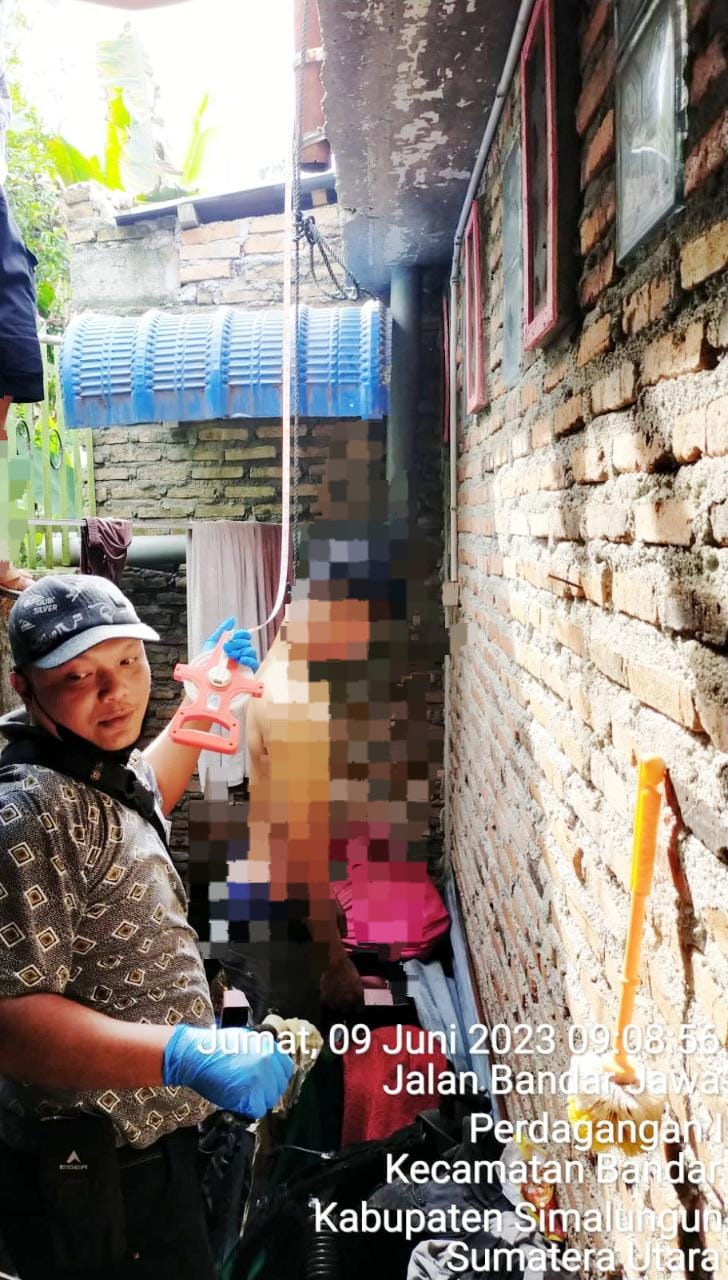 Personel Polsek Perdagangan Resor Simalungun yang dipimpin Kanit Reskrim Polsek Perdagangan IPTU Fritsel G. Sitohang, SH, gerak cepat Evakuasi penemuan mayat gantung diri di dalam Gudang Rumah, Perumahan Java Residensi Huta V Nagori Bandar Jawa Kecamatan Bandar Kabupaten Simalungun, Jumat (9/6/2023).