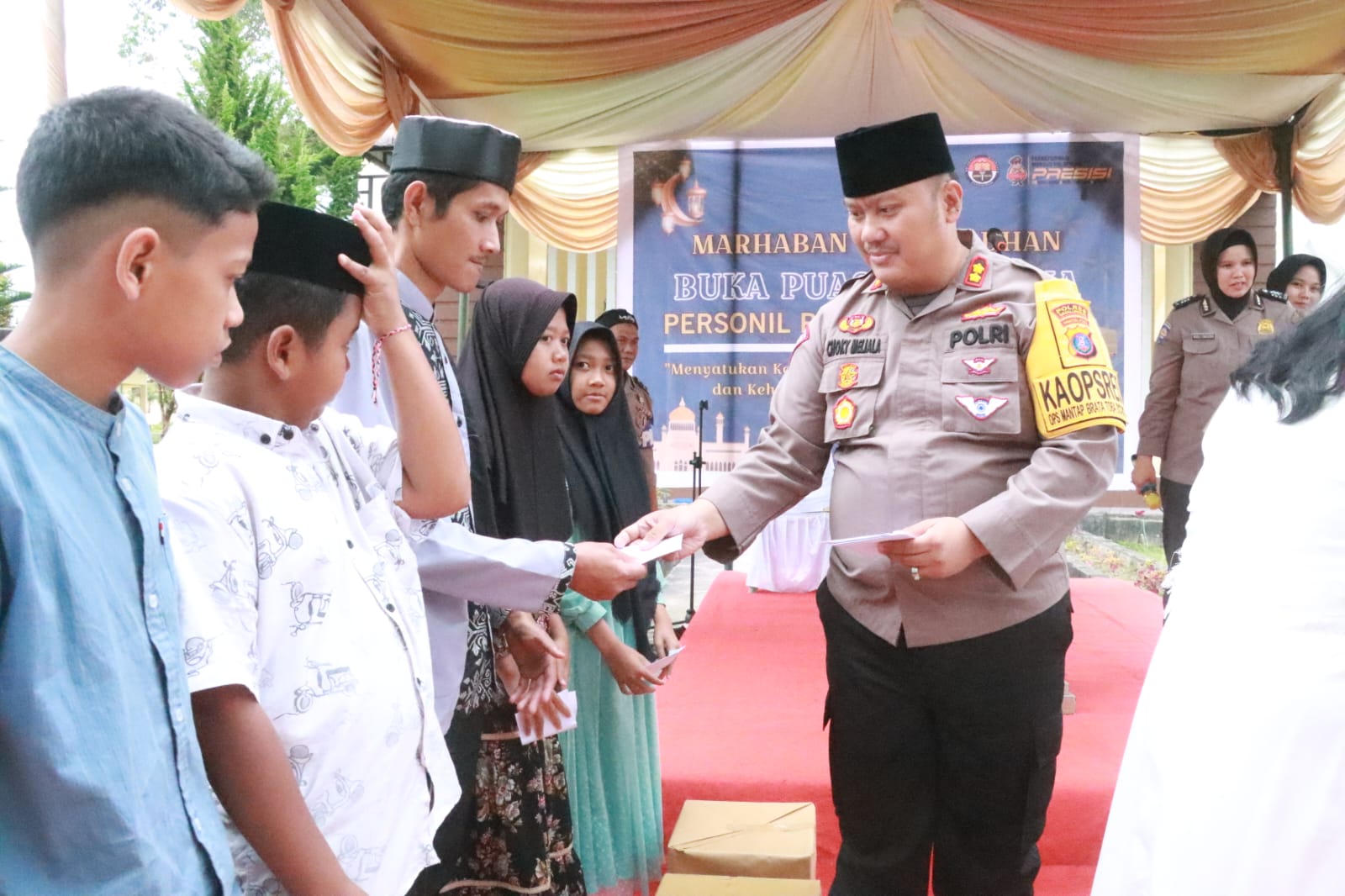 Kapolres Simalungun, AKBP Choky Sentosa Meliala, S.I.K., S.H., M.H., bersama Ibu Ketua Cabang Bhayangkari Simalungun Ny. Rina Choky Sentosa Meliala, dan para pejabat utama Polres serta anggota Polres yang beragama Islam turut hadir dalam acara ini. Kegiatan ini juga dihadiri oleh anak-anak yatim dari sekitar Kecamatan Raya.