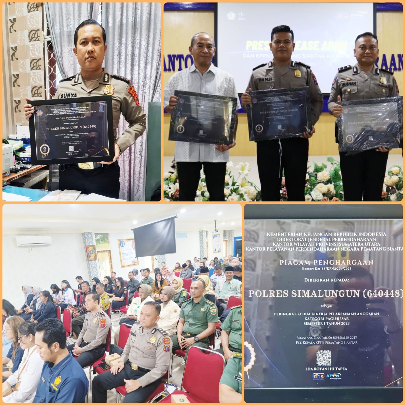 Polres Simalungun mendapatkan penghargaan atas kinerja pelaksanaan anggaran dengan meraih peringkat kedua dalam kategori pagu besar untuk semester-I tahun 2023. Penghargaan diberikan secara langsung Plt. Kepala KPPN Pematang Siantar kepada Kapolres Simalungun AKBP Ronald F.C Sipayung, S.H., S.I.K., M.H., yang diwakili oleh Kasikeu Polres Simalungun IPDA Surya Hadi, SE.
