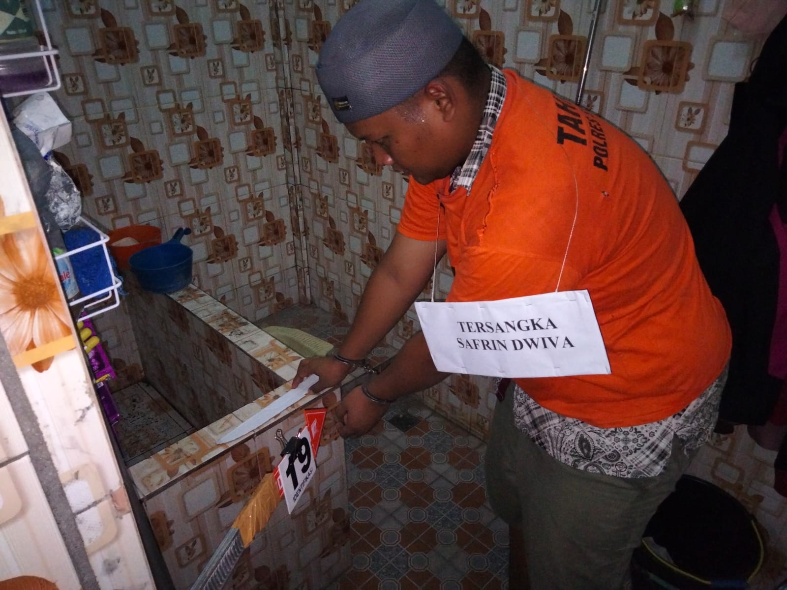 Kemudian tersangka berjalan meninggalkan korban menuju kamar mandi dan meletakkan pisau diatas bibir bak mandi, sambil memegangi tangannya yang terluka, tersangka berjalan keluar dari rumah korban dengan terlebih mengunci pintu korban dari luar.