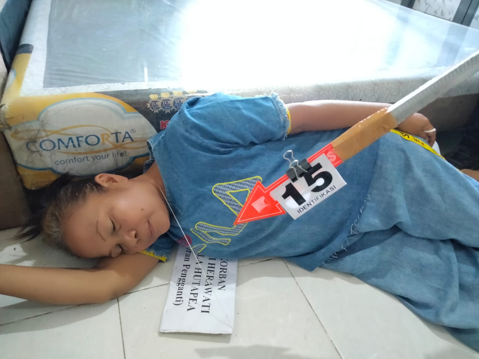 Korban Lenni Herwati Bibela Hutapea (Ibu) ditusuk dari arah depan sebanyak 1 kali, sehingga korban terjatuh keatas tempat tidur dan terpeleset kembali jatuh kelantai tidak sampai disitu tersangka memposisikan diri menjadi jongkok dan menusuk kembali di bagian dada sebanyak 1 kali.