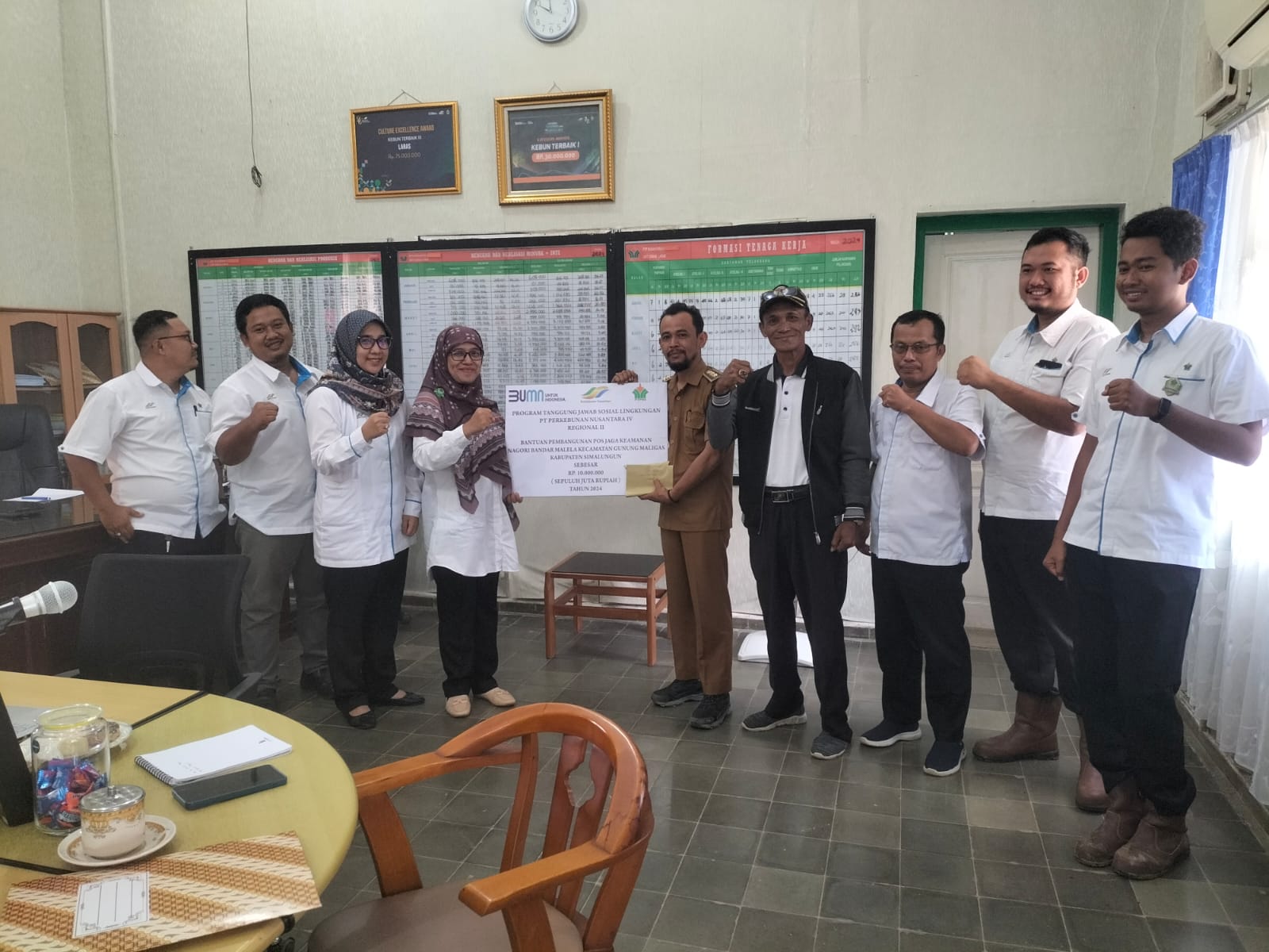 menyerahkan bantuan Tanggung jawab Sosial dan Lingkungan ( TJSL ) Tahun 2024 untuk Pembangunan Pos Keamanan di Nagori Bandar Malela Kecamatan Gunung Maligas Kabupaten Simalungun, Sumatera Utara. Bantuan yang di berikan sebesar, Rp10.000.000, (Sepuluh Juta Rupiah.)