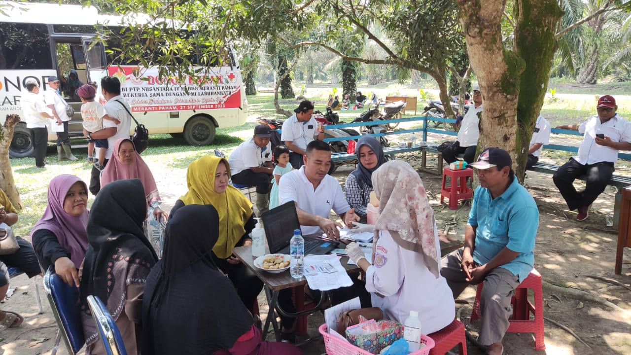 Manajemen PTPN IV Unit usaha Meranti Paham, bersama IKBI (Ikatan keluarga Besar Istri) dan Palang Merah Indonesia (PMI) Labuhan batu melaksanakan kegiatan bakti sosial donor darah.