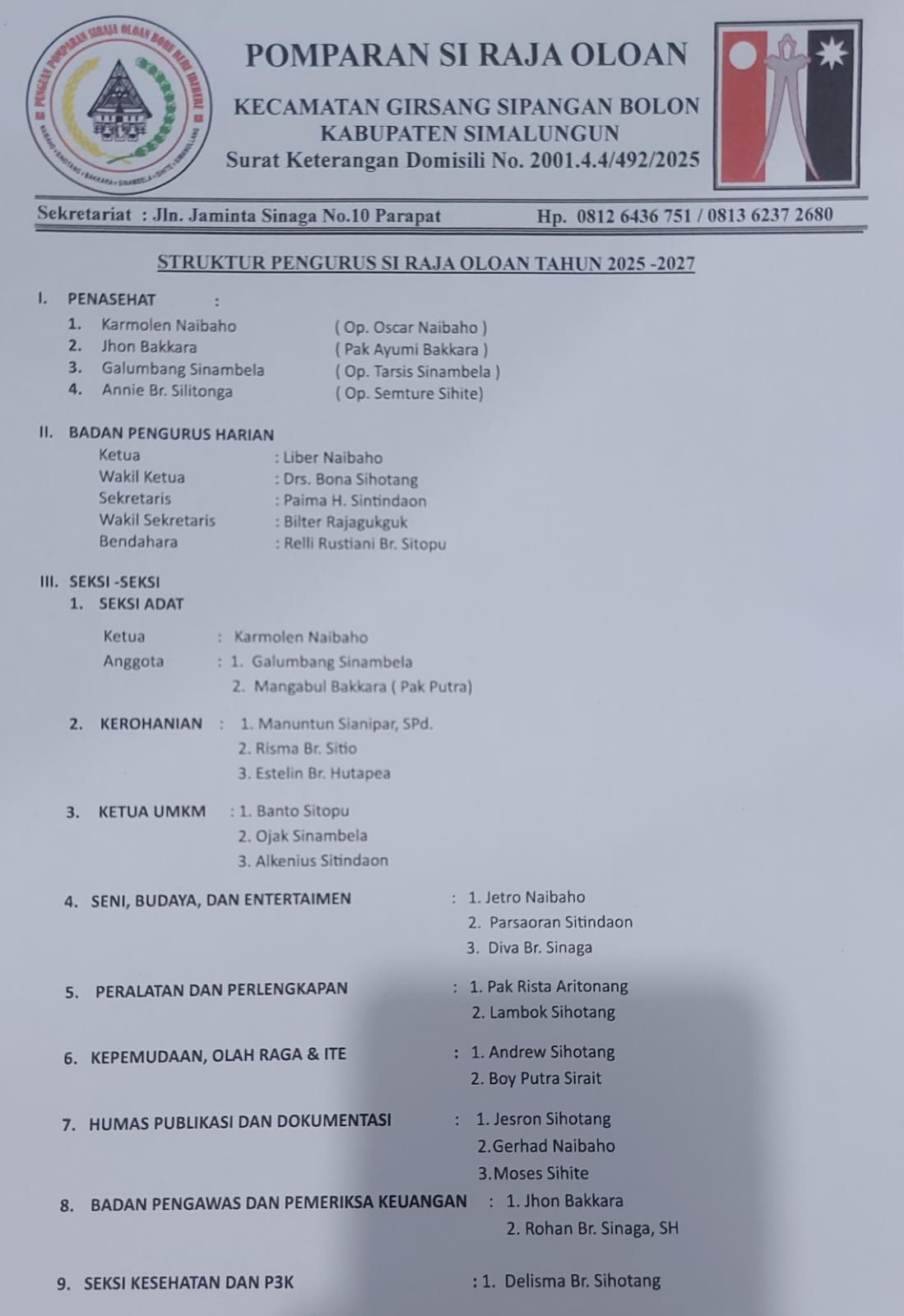 Ipda Pol (Purn) Liber Naibaho sebagai Ketua, Drs.Bona Sihotang (Sekretaris), Lely br Sitopu (Bendahara). Pelantikan sekaligus Pesta Bonataon 2025 ini dihadiri Ketua SRO Kabupaten Samosir Manogar Naibaho dan Ketua SRO Medan Ependi Naibaho, sementara Ketua DPW SRO Sumut Sanggam Bakkara SH menyampaikan u apan selamat dan Sukses melalui VidVol dan Zomm dengan sebuah Bunga Papan pertanda Bahagia dan Ucapan selamat kepada kepengurusan SRO terpilih.