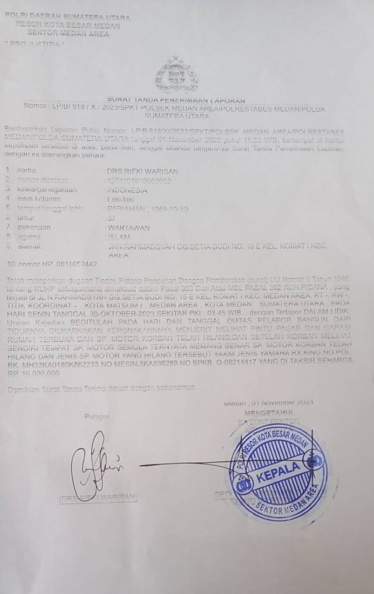 Menurut keterangan Rifki Warisan kepada wartawan, Rabu (1/11/2023), usai membuat laporan kehilangan di Polsek Medan Area, disebutkan, rumahnya dibobol maling pada Senin (30/10/23) dinihari sekitar pukul 03.45 Wib, mengakibatkan kehilangan sepeda motor Yamaha RX King No Pol 4024 AII yang dinilai seharga Rp 16 juta.