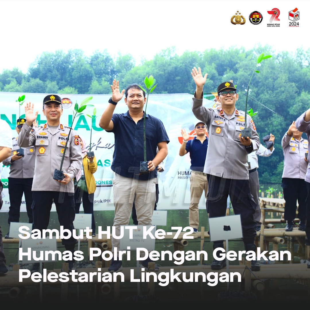 Menyambut HUT Ke-72 Humas Polri, Kadiv Humas Polri Irjen Pol. Dr. Sandi Nugroho, S.I.K., S.H., M.Hum., memimpin aksi penanaman mangrove di Taman Wisata Muara Angke, Jakarta Utara pada Jumat (13/10/2023).