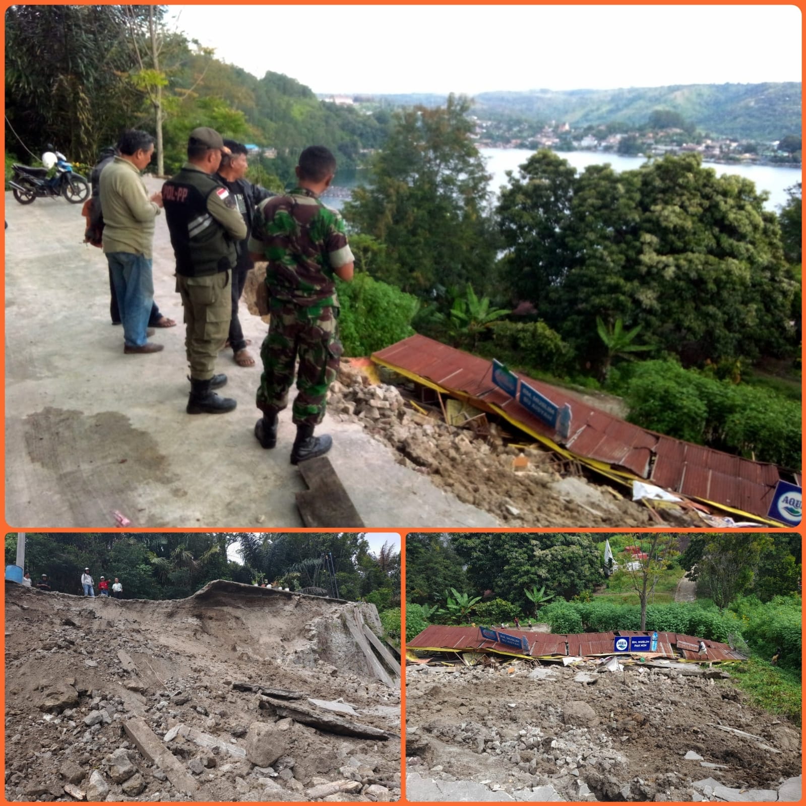 Satu unit warung Panatapan Parapat milik Pak Min yang berada ditepi Jalinsum Parapat tepatnya di Dusun Sualan Panatapan, Nagori Sibaganding, Kecamatan Girsang Sipangan Bolon, Kabupaten Simalungun amblas kedalam jurang berketinggian kurang lebih 10 meter, Rabu (19/9/2023). Sekira jam 13:30 WIB.