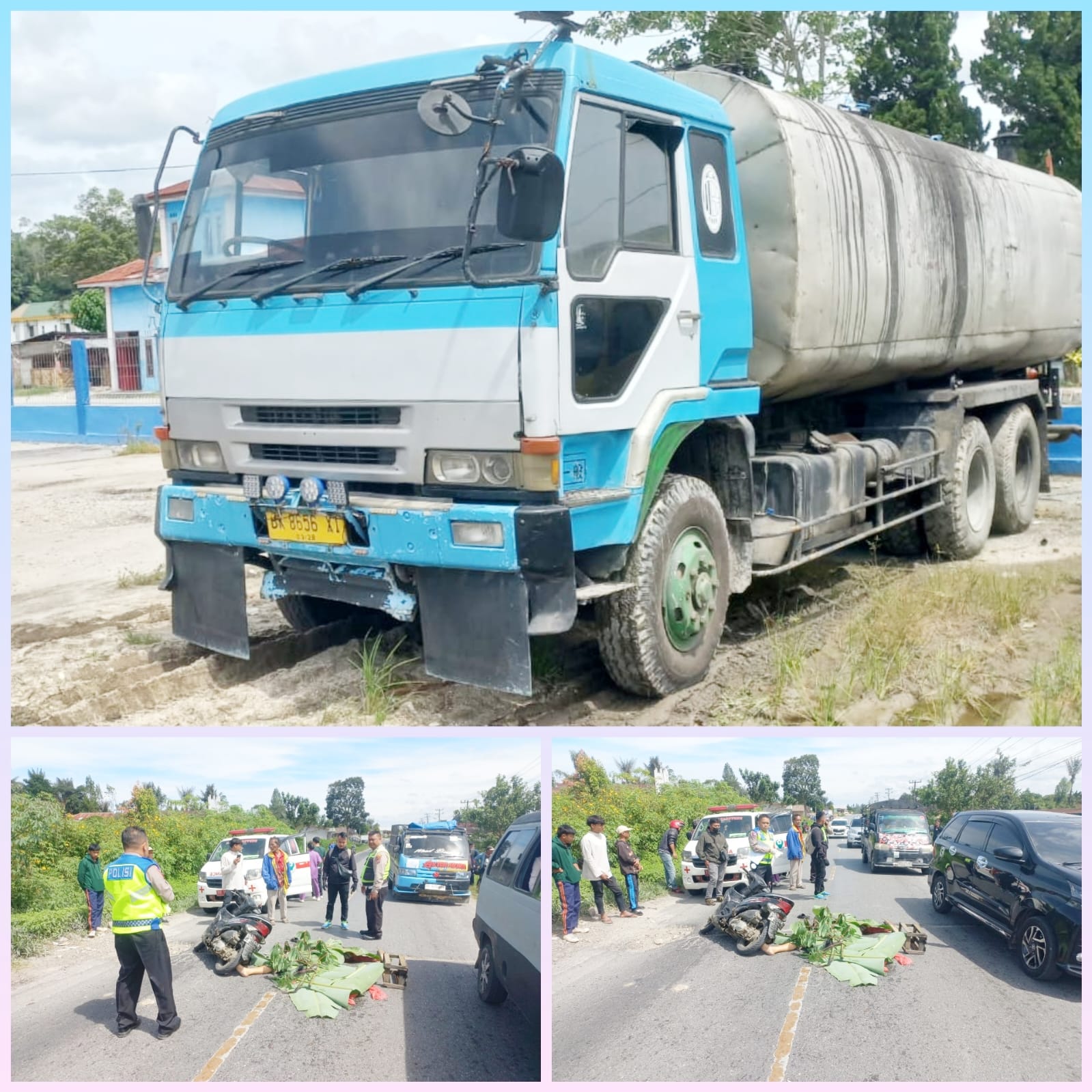 Rahmat Simbolon (52) pengendara sepeda motor Honda Spacy No. Pol. BB 3260 NL berbonceng 3, warga Perumnas Hutagurgur, Kecamatan Dolok Sanggul, Kabupaten Humbang Hasundutan terjatuh pas ijalan berlobang, tewas di TKP setelah disambut truck Tangki pengangkut CPO.