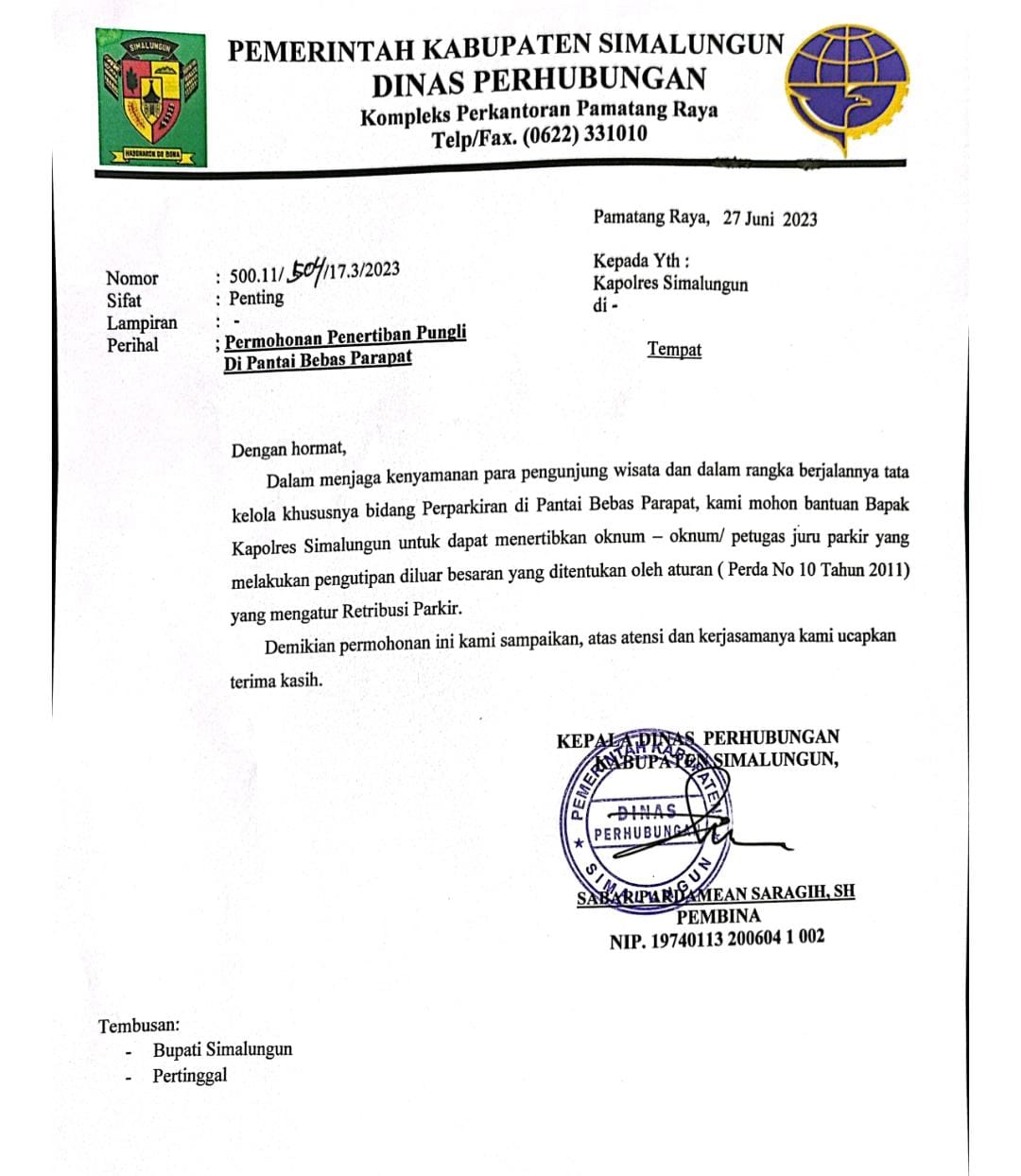 “Dalam menjaga kenyamanan para pengunjung wisata dan tata kelola khususnya bidang Perparkiran di Pantai Bebas Parapat, kami mohon bantuan Kapolres Simalungun untuk dapat menertibkan oknum- oknum/ petugas JURU PARKIR yang melakukan pengutipan diluar besaran yang ditentukan oleh aturan (Perda) yang mengatur Retribusi Parkir”.