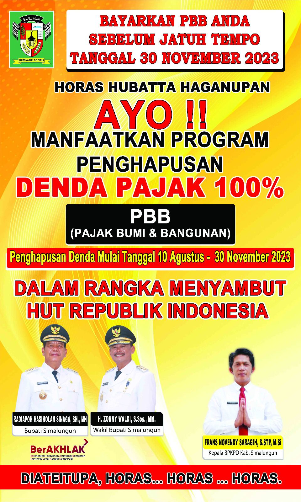Pemerintah Kabupaten Simalungun menyampaikan himbauan berupa penghapusan Denda PBB 100% Dalam rangka menyambut HUT RI ke 78 tahun 2023.