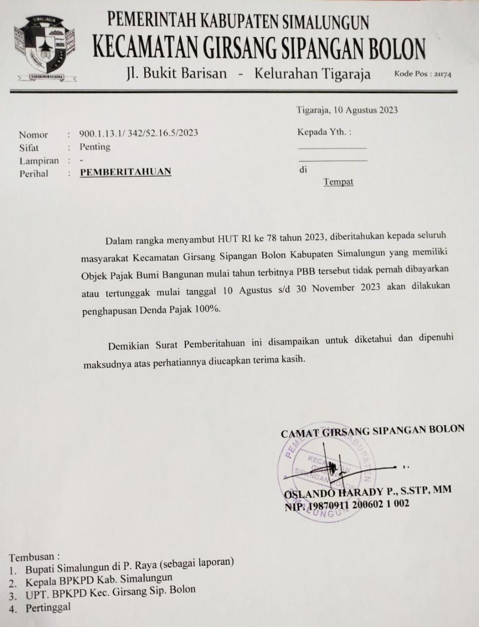 Berikut petikannya, “Diberitahukan kepada seluruh masyarakat Kecamatan Girsang Sipangan Bolon Kabupaten Simalungun yang memiliki Objek Pajak Bumi Bangunan mulai tahun terbitnya PBB tersebut tidak pernah dibayarkan atau tertunggak mulai tanggal 10 Agustus s/d 30 November 2023 akan dilakukan penghapusan Denda Pajak 100%”.