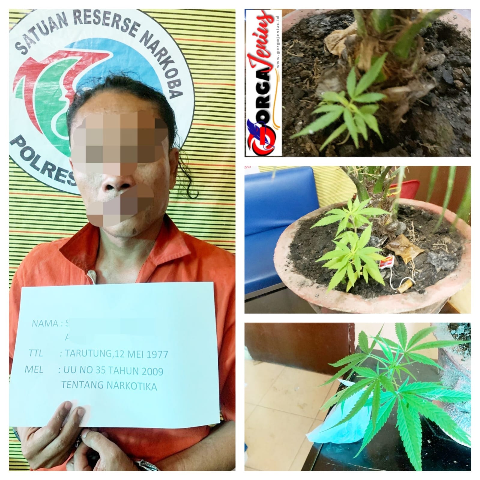 Aparat Polres Samosir berhasil mengamankan SS, gegara yang bersangkutan tanam 5 batang pohon ganja dipot bunga dan 1 batang diperladangan.