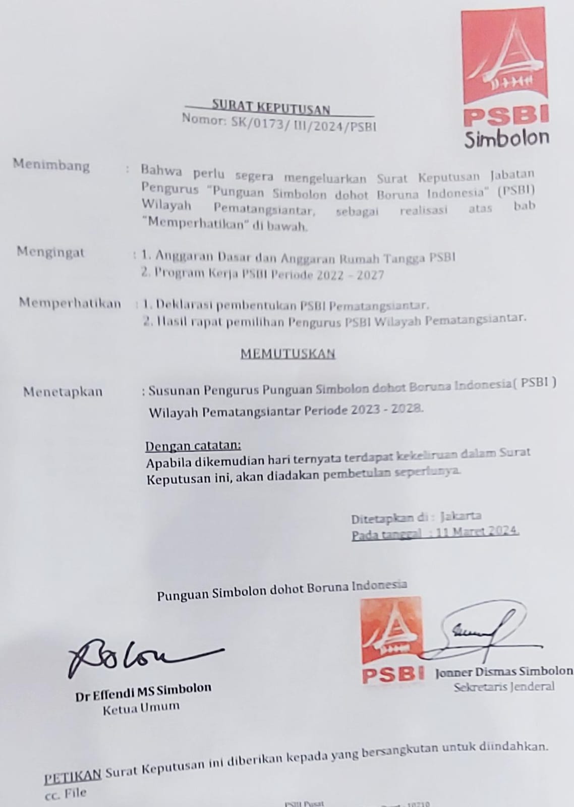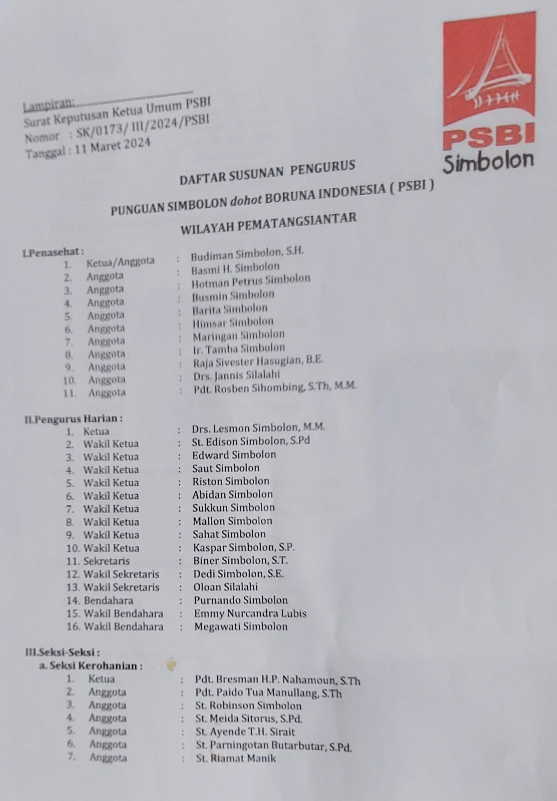 Adapun Pengurus PSBI Pematang Siantar Periode 2023-2028, sesuai SK: 0173/III/ 2024/PSBI, Drs. Lesmon Simbolon, MM sebagai Ketua, Purnando Simbolon (Bendahara), Biner Simbolon (Sekretaris) dan sekaligus melantik Ketua-Ketua, Sekretaris dan Bendahara masing-masing Sektor diantaranya: