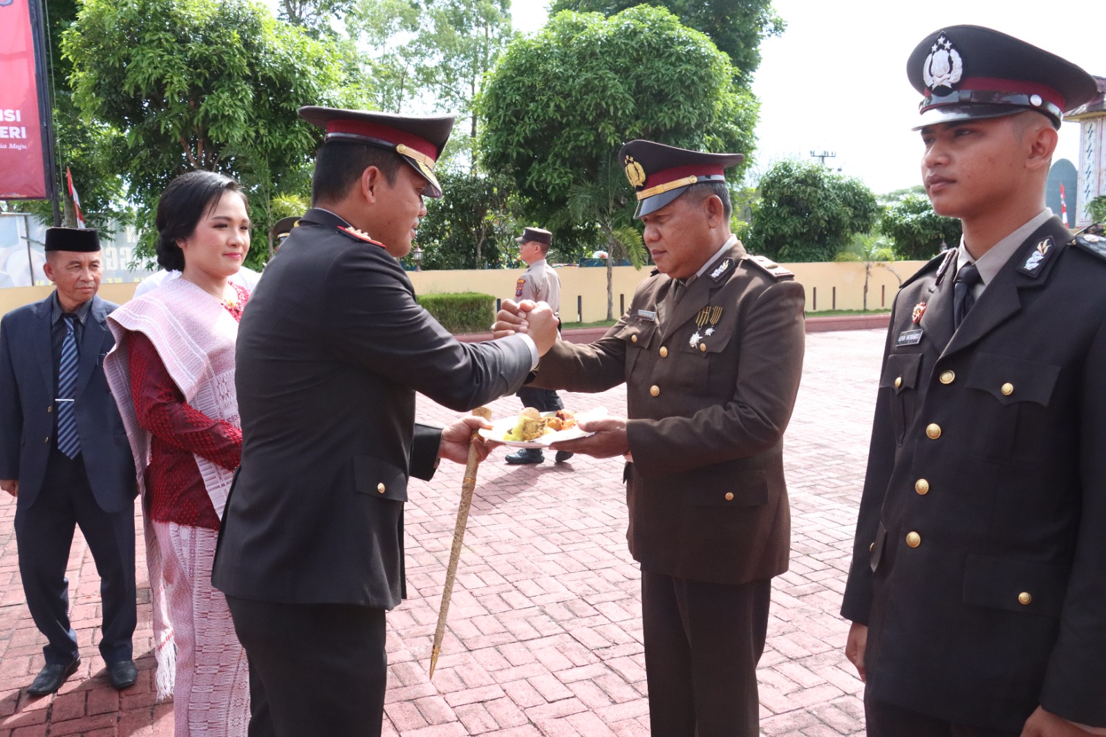 Selanjutnya, nasi tumpeng pertama diberikan kepada Personel yang paling tua IPDA Indra Hasibuan sebagai bentuk penghargaan dan penghormatan terhadap jasa dan pengabdiannya selama ini. Sementara itu nasi tumpeng kedua diberikan kepada Personel yang paling muda BRIPDA Melkior Sipayung sebagai motivasi bagi generasi muda untuk selalu bersemangat dan berdedikasi dalam bekerja.