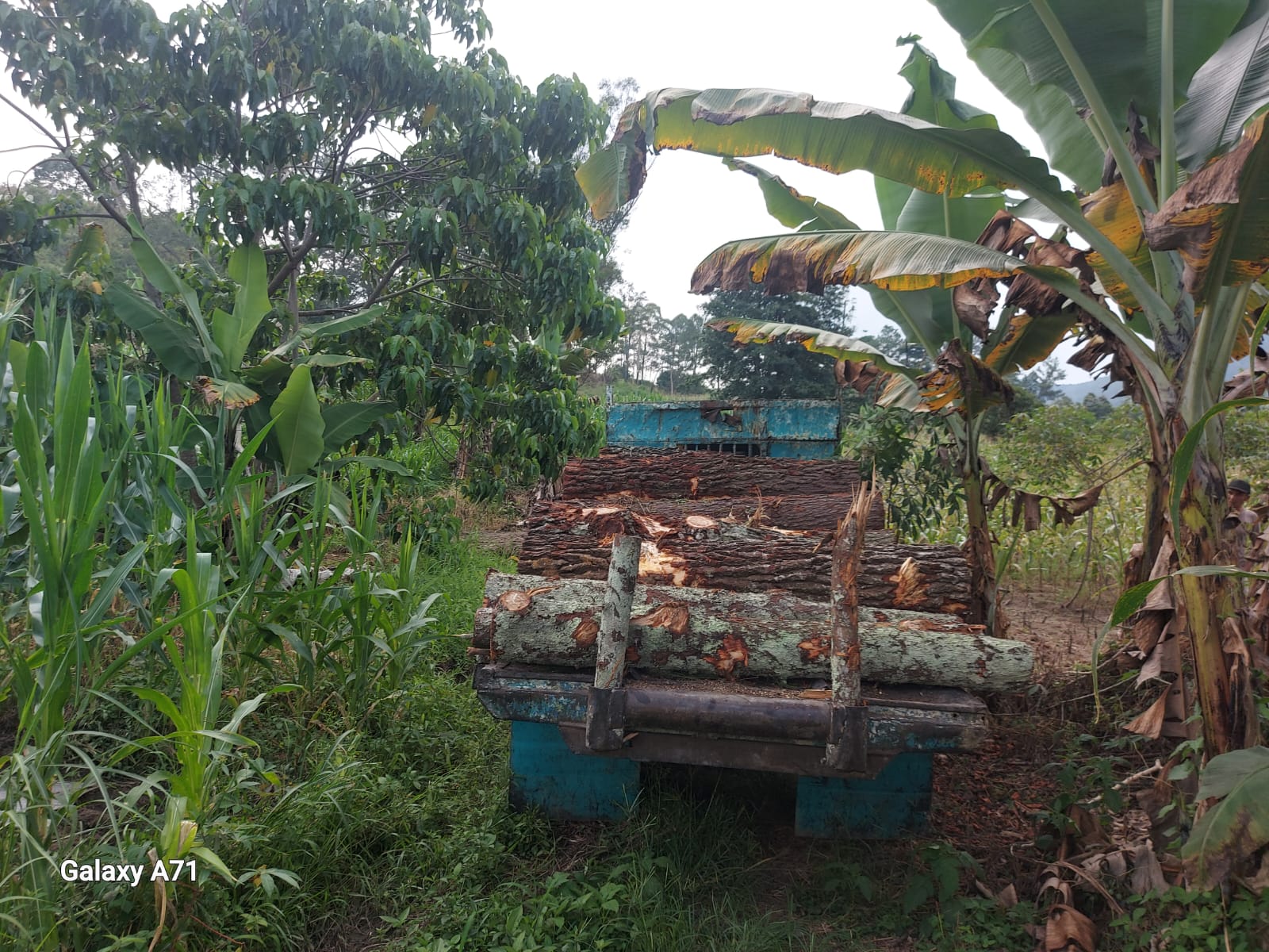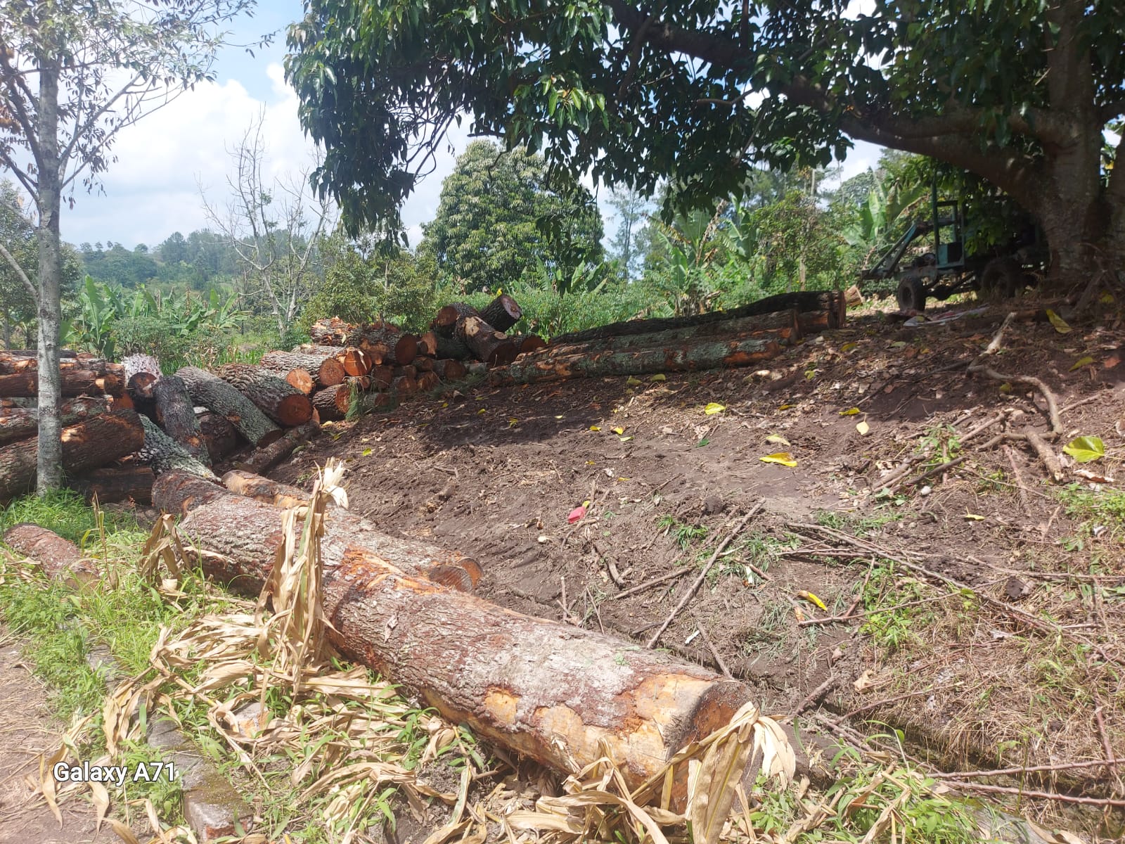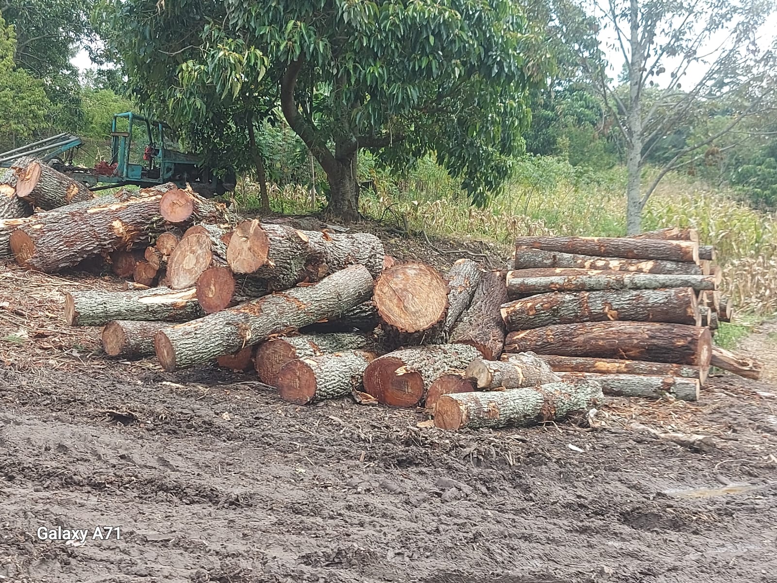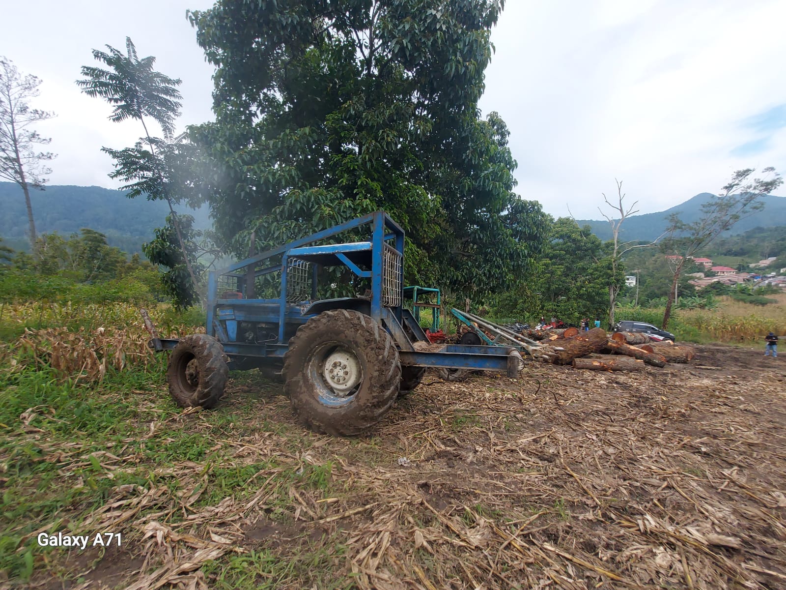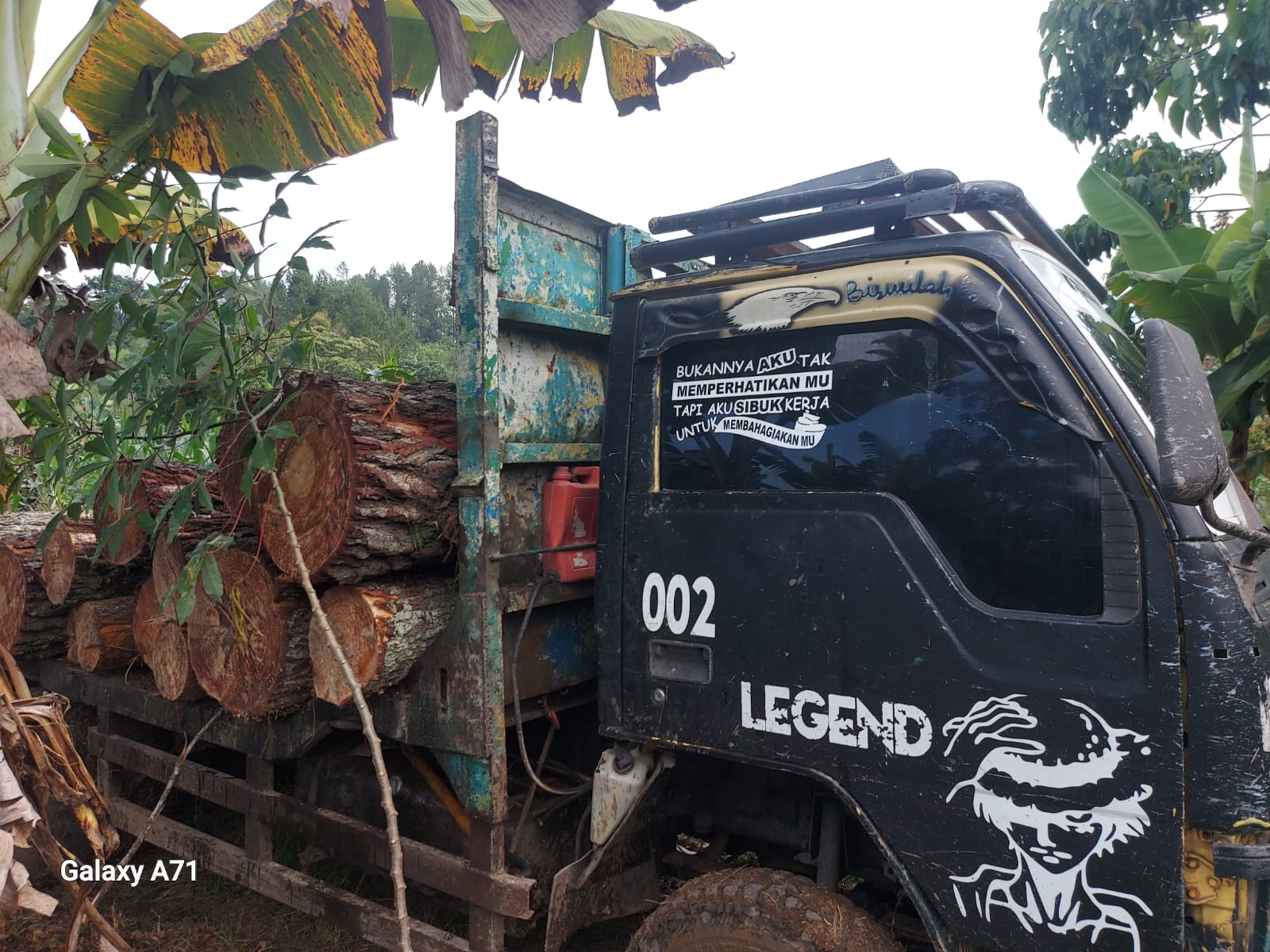 Dari hasil cek lokasi penumpukan kayu loging pinus, ditemukan juga sejumlah Jeregen kosong berbau BBM Solar, 1 unit Forklift,1 Jonder,1 truk Canter BK 3999 TU bermuatan kayu loging diameter 2 meter.