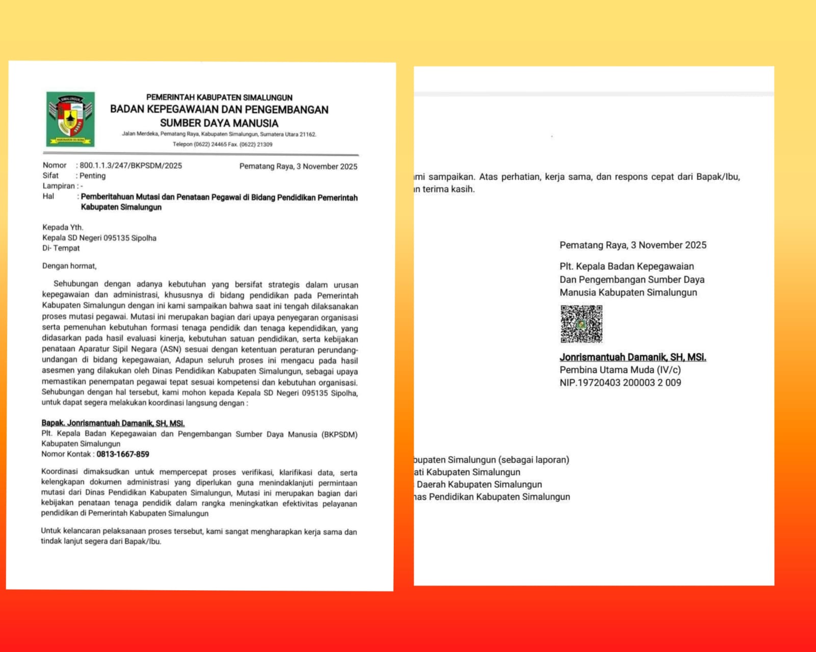Beredar surat edaran palsu mengenai Pemberitahuan Mutasi dan Penataan di Bidang Pendidikan Pemerintah Kabupaten Simalungun. Surat dengan nomor 800.1.1.3/247/BKPSDM/2025 tertanggal 3 November 2025 ini ditujukan kepada Kepala SD Negeri 098166 Perumnas.