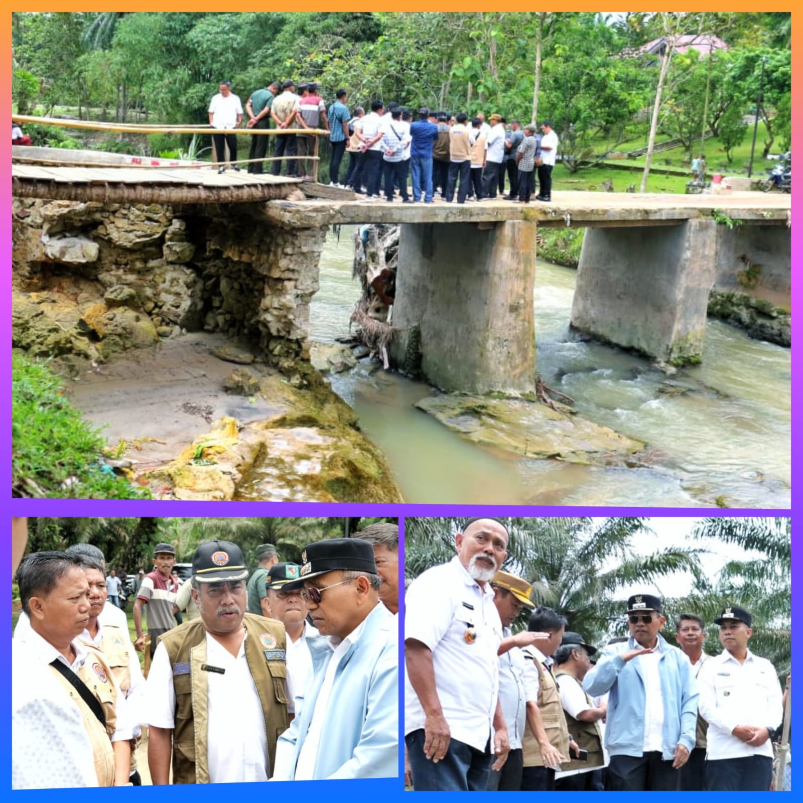 Bupati Simalungun Anton Achmad Saragih di dampingi Wakil Bupati Benny Gusman Sinaga dan Kepala Pelaksana Badan Penanggulangan Bencana Daerah (Kalak BPBD) Resman Saragih meninjau jembatan putus di Nagori Dolok Hataran Kecamatan Siantar, Simalungun, Sumut, Rabu (9/4/2025).