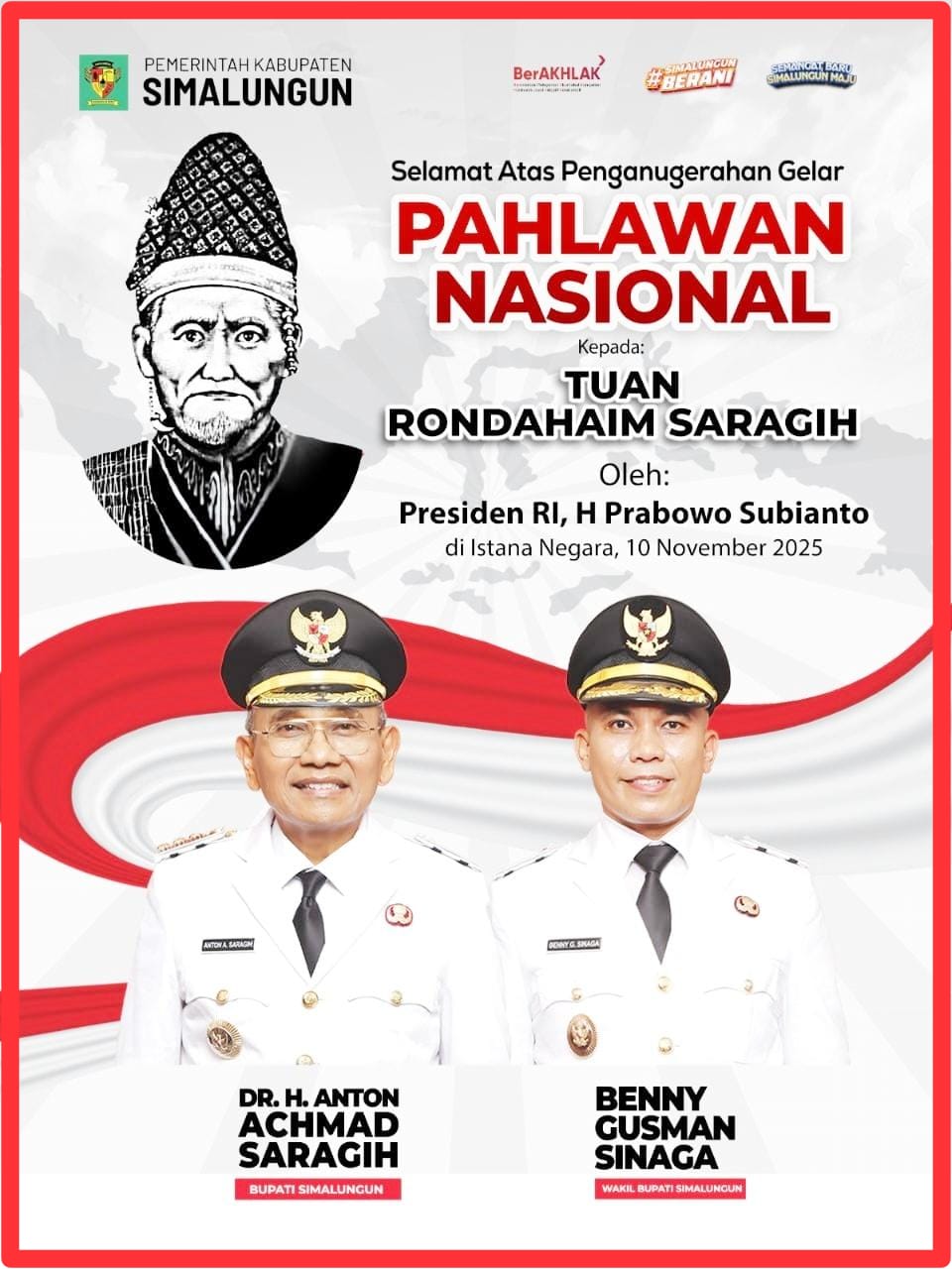 BANGGA dan penuh syukur masyarakat Kabupaten Simalungun, Sumatera Utara, ketika Pemerintah Kabupaten bersama masyarakat menggelar acara Syukuran dan Pesta Rakyat atas penganugerahan gelar Pahlawan Nasional kepada Tuan Rondahaim Saragih Garingging.