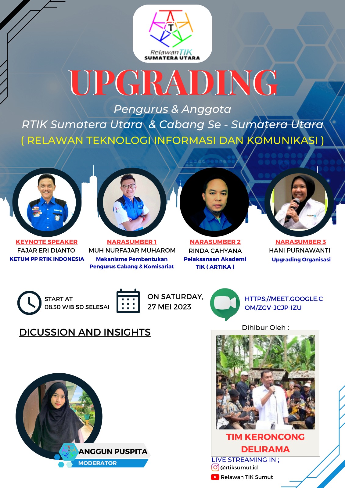 Pengurus Wilayah Relawan Teknologi Informasi Komunikasi Provinsi Sumatera Utara (RTIK SUMUT) akan menyelenggarakan upgrading dengan tema “Relawan Muda : Semakin Digital dan Peduli Budaya Bangsa” . Acara akan digelar secara daring melalui platform Google Meeting pada Sabtu, 27 Mei 2023, pukul 08.00 – 17.00 WIB.