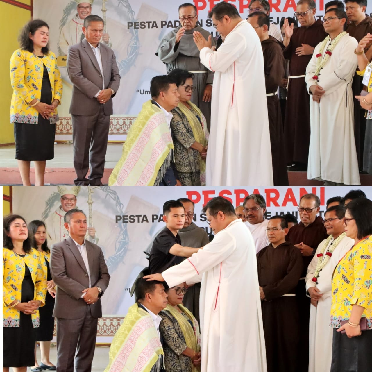 Uskup Agung Medan Mgr Kornelius Sipayung OFM Cap, memberikan pemberkatan kepada Bupati Simalungun Radiapoh Hasiholan Sinaga bersama istri Ratnawati Sidabutar agar diberikan kekuatan dalam menjalankan roda pemerintahan di Kabupaten Simalungun.