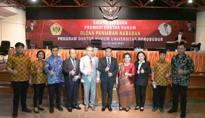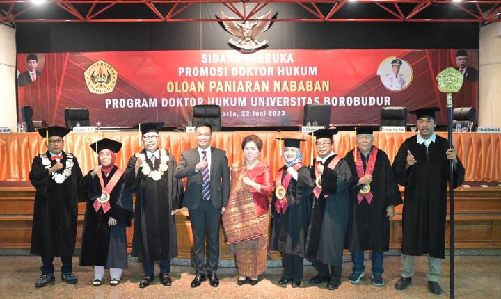 “Saya mengucapkan terimakasih kepada keluarga dan sahabat yang selama ini telah mendukung dalam proses penyelesaian program Doktor Hukum. Sehingga hari ini, saya sudah memperoleh gelar Doktor (S.3). Saya juga mengucapkan terimakasih banyak kepada keluarga besar Universitas Borobudur khususnya kepada promotor dan penguji yang selama ini selalu membimbing untuk menyelesaikan program Doktor Hukum,” ucap Dr Oloan Paniaran Nababan.
