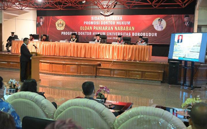 Wakil Bupati Humbahas Oloan Paniaran Nababan SH, MH ujian sidang terbuka promosi Doktor Hukum di Kampus A Aula Lantai 8 Gedung D Universitas Borobudur Jakarta, Kamis (22/6/2023).