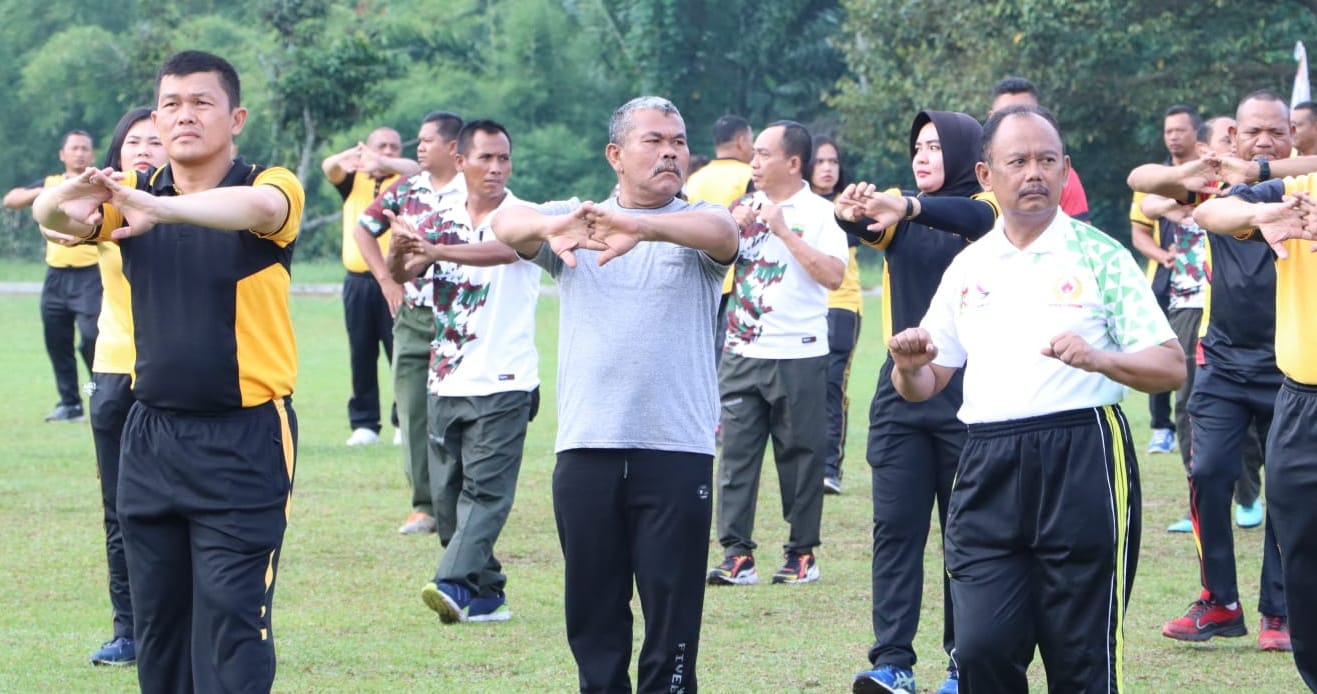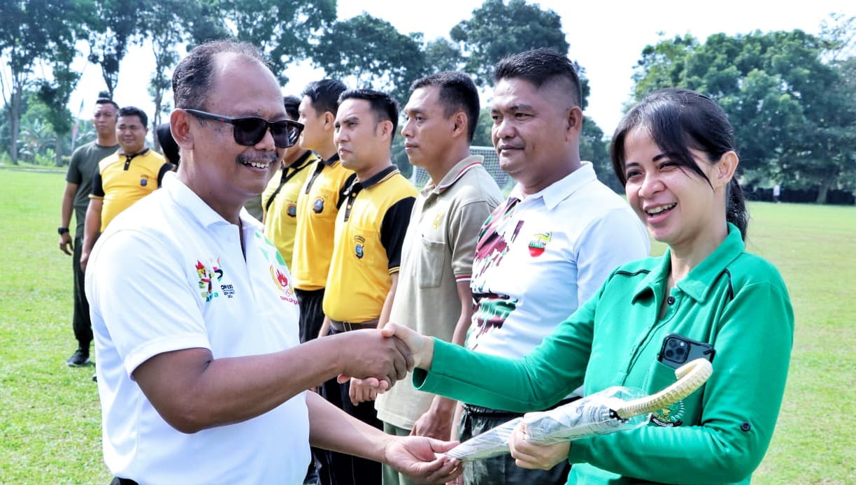 Bupati Simalungun diwakili Wakil Bupati H Zonny Waldi mengikuti olahraga bersama Pemerintah, TNI dan Polri Bersinergi di Lapangan Koramil Model, Jln Asahan Kecamatan Siantar, Simalungun, Selasa (27/6/2023).