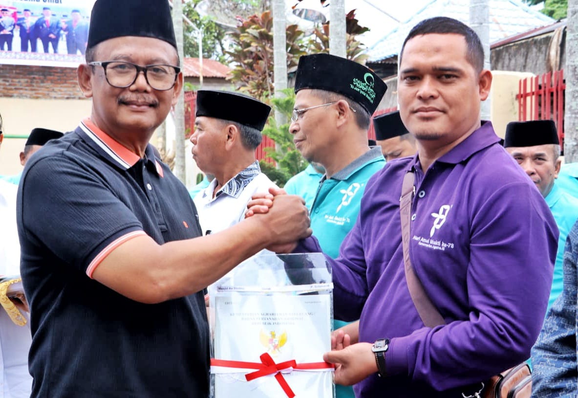 Penghargaan dan sertifikat tanah ini di berikan langsung oleh Wakil Bupati H Zonny Waldi, Sekda Esron Sinaga, Kakan Kemenag Ahmad Sofian, Kakan ATR/BPN Moren Naibaho.