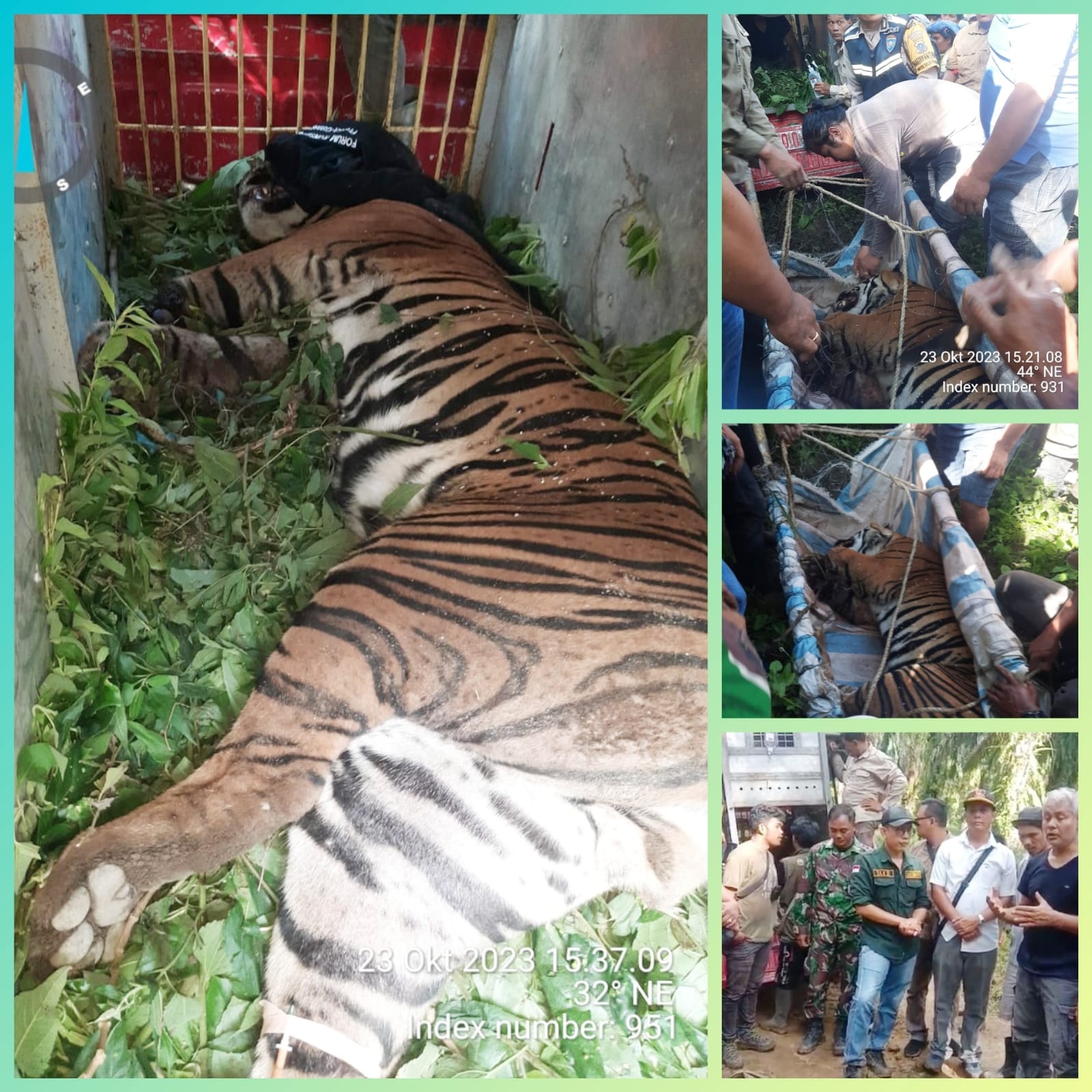 Di lokasi, pihak BBKSD bersama warga melihat dari kejauhan mendapati seekor harimau jantan terjerat, namun melihat kondisi hari menjelang malam, pihak BBKSDA memutuskan rencana untuk evakuasi dilaksanakan keesokan harinya, Senin (23/10).