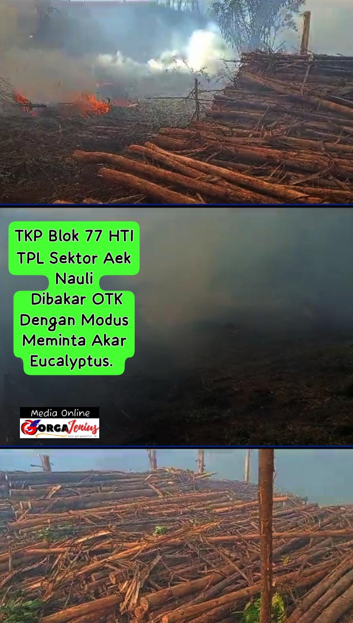 Lokasi yang dibakar sekelompok orang itu berada di “Blok 77”, dan bukan hanya lahan yang sudah ditebang terbakar, tetapi puluhan ton kayu eucalyptus yang sudah ditebang ikut hangus terbakar.
